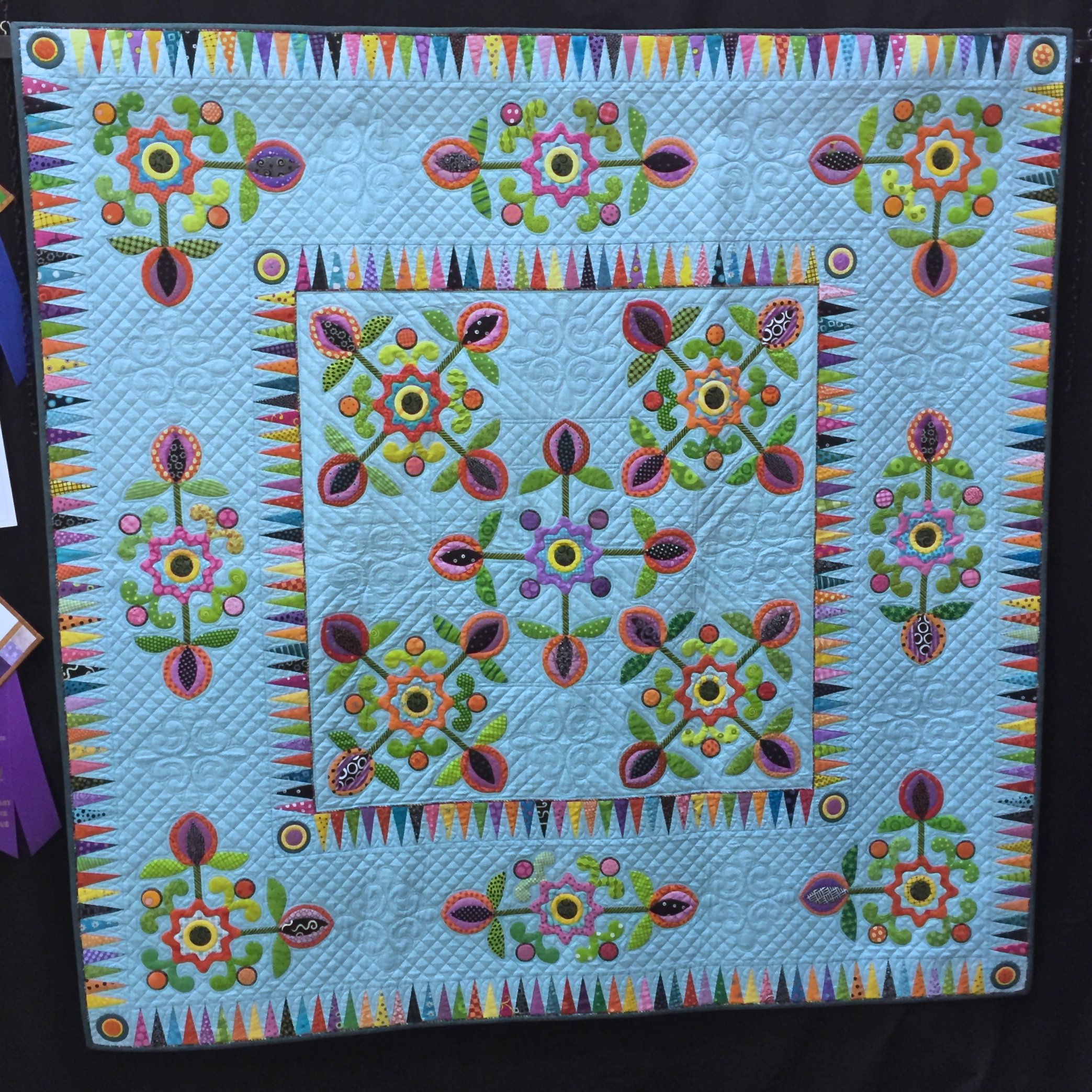 Several years ago, I made a quilt called Garden of Pomegranates…adapted from a commercially available pattern. Because I had to rush the quilting to meet a show deadline, the quilt did not live up to its potential. Today it serves as a reminder to slow down, enjoy the process and give each quilt the time it deserves. The new quilt, BACK TO THE GARDEN is really a do over. Since it would be boring to make an identical quilt, I selected a different color scheme and fabrics; I changed the setting and reduced the scale to up the degree of difficulty.
