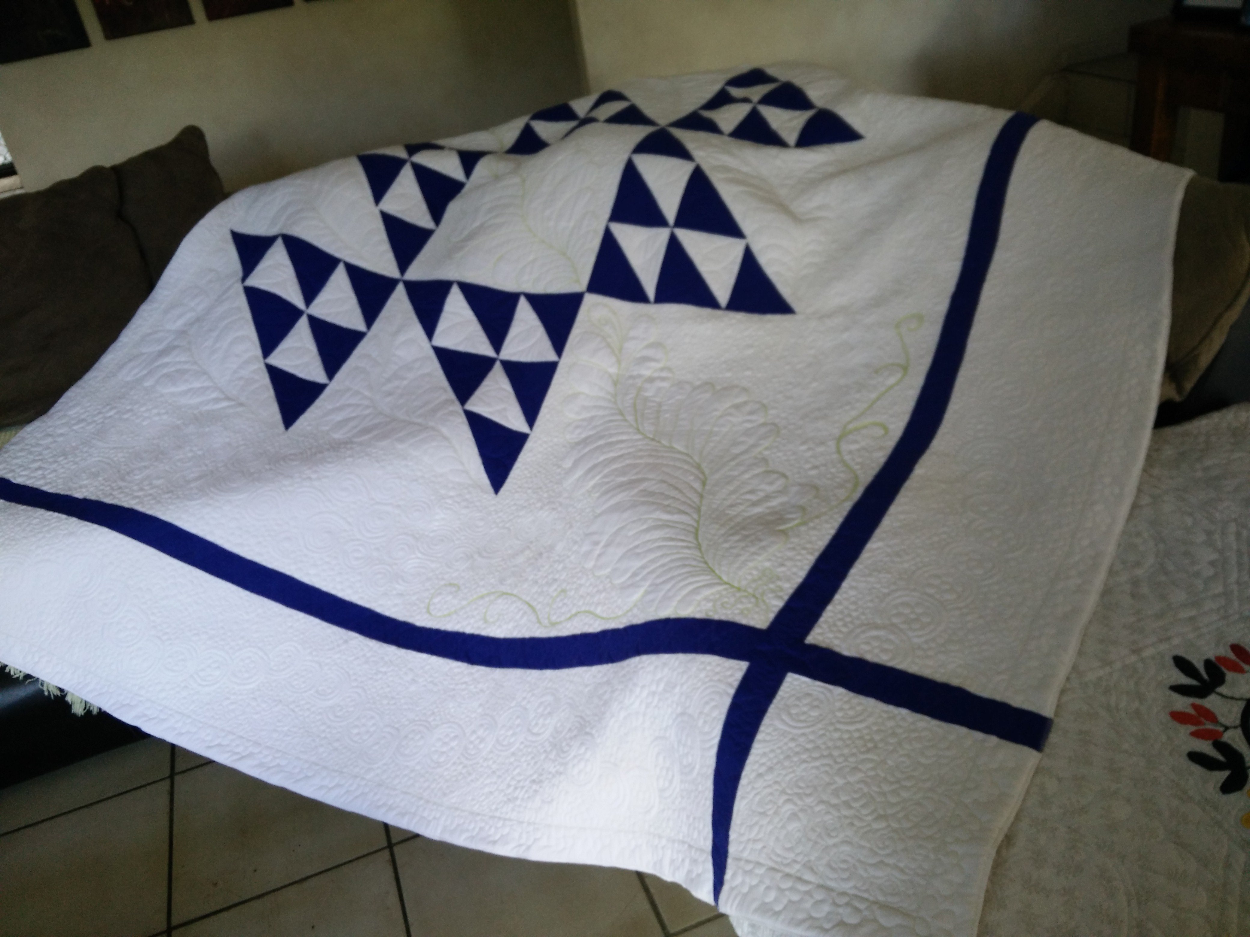 2 color quilt in royal blue and white with wool mix batting. I think the pattern is flock of geese and I have always loved the pattern but didnt like working in little triangles so made a large panel in one corner and a strip for balance in the other corner. It was actually to practice machine quilting and has a lot of negative space to practice in. Enjoyed the quilting immensely. I have run a very large light green feather through the middle of the quilt. I didn't know what to name it, so sent an email around where I work with a picture of the quilt and ask for suggestions. One of the guys in my team came up with Goose feathers because his mother used to say it when she was angry. I thought that was the perfect name. At least my cat likes it.