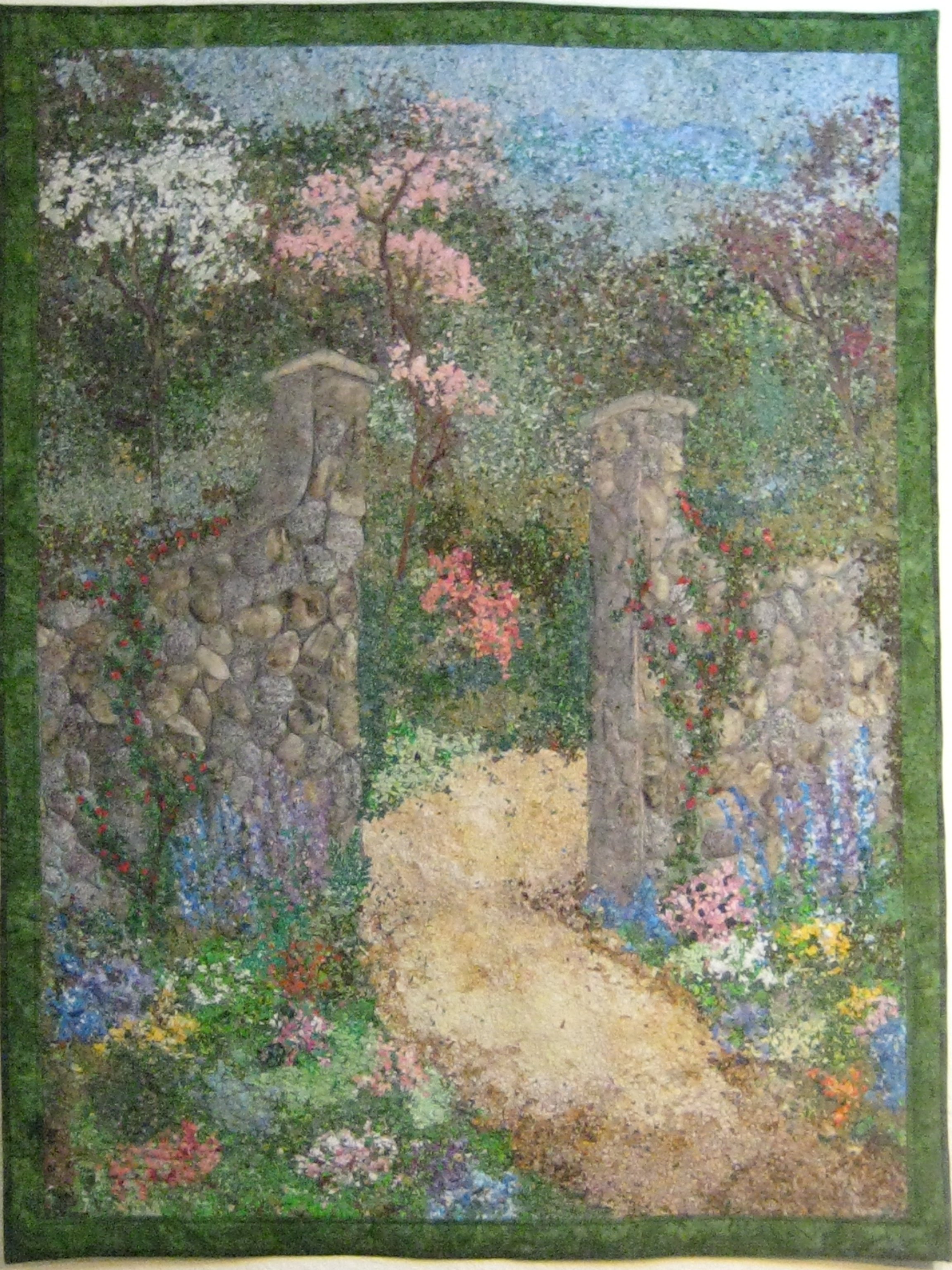 This is a confetti pieced art quilt. I lived in England for a few years. This quilt reminds me of the walks I took in the great gardens and Castles. The wall is hand painted pieces each attached individually. My quilt is in my living room I love looking at the path it really brings you in. It has many bags of confetti fabrics I cut for weeks!