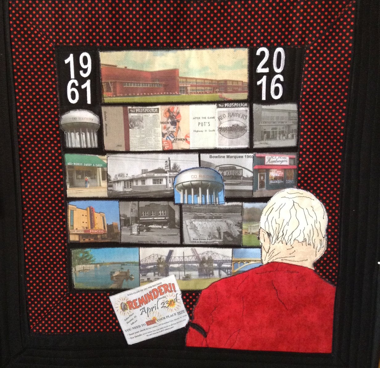 Made for the 55th reunion of 1961 Decatur High school graduates. My quilt features photos of Decatur, AL taken in the 60's. The quilt will be auctioned with proceeds going to the class Scholarship fund for graduates of the school.