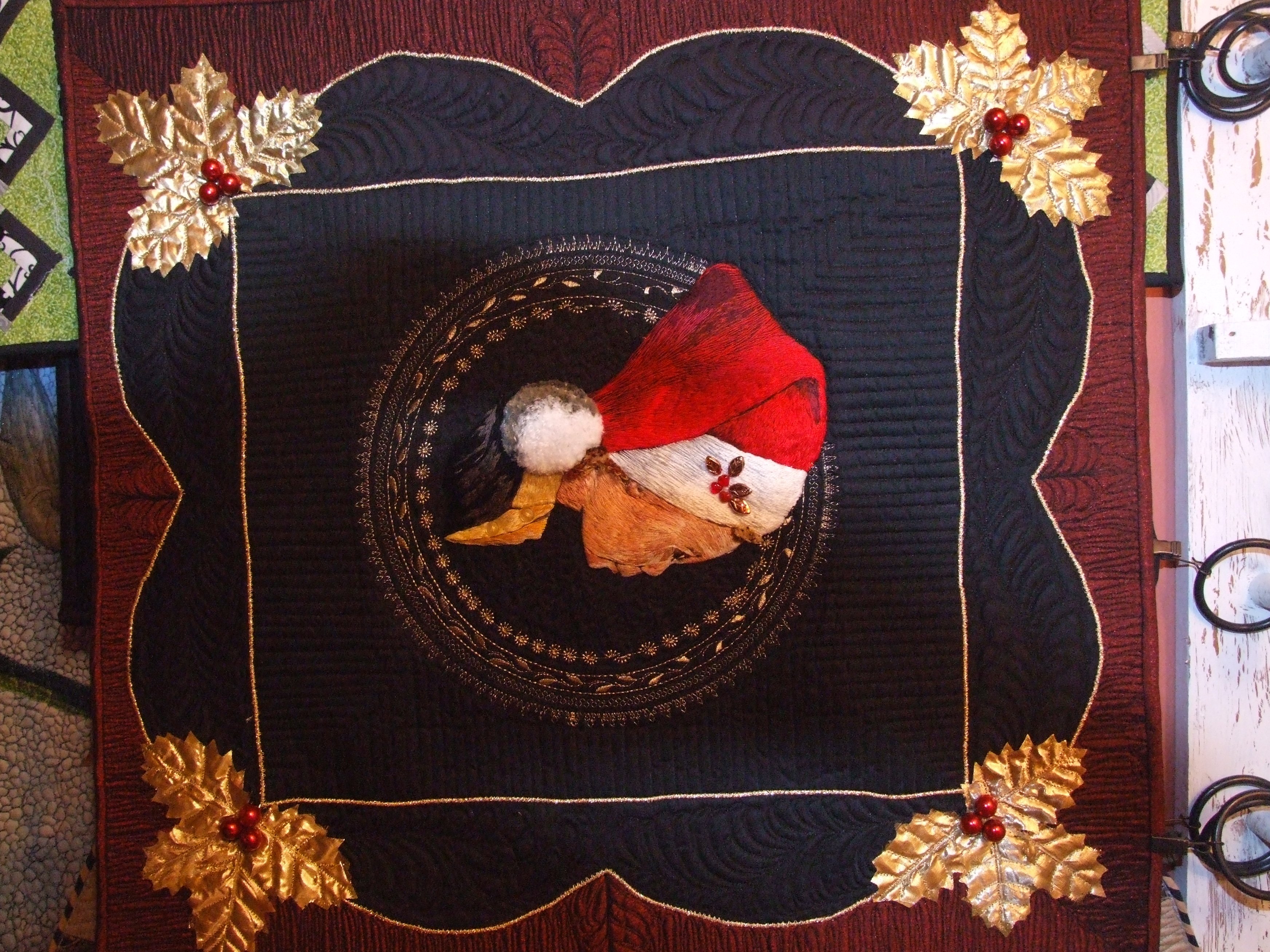 This is a hand thread painting of 2 year old Kaleb, a friend's grandson. I have machine quilted, appliqued and used couching on this piece. The gold holly and berries are appliqued. The pom pom on the Santa hat is turkey work, a technique I learned when I was doing crewel embroidery many years ago. There are also two little yellow buttons on his shirt.