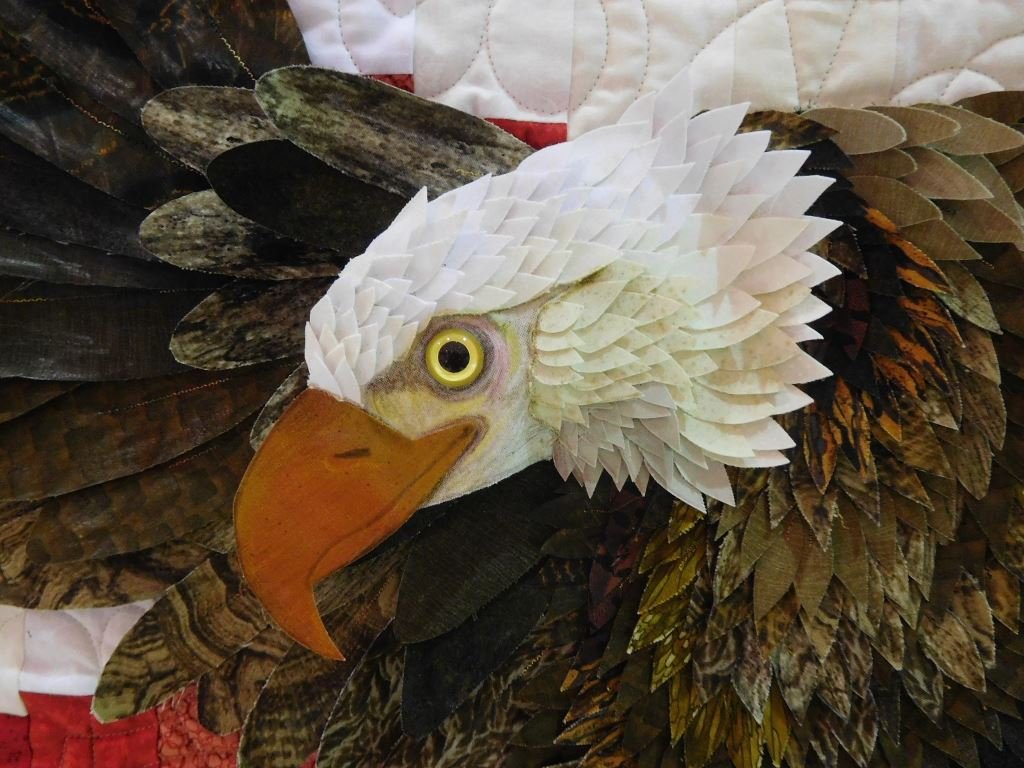 On the wings of an Eagle is an original eagle design built on a Bargello pattern flag. The bird is created with individual feathers that are made with Joan Shay's Petal Play technique. Every feather is individually sewn and the face is enhanced using Prismacolor pencils.
