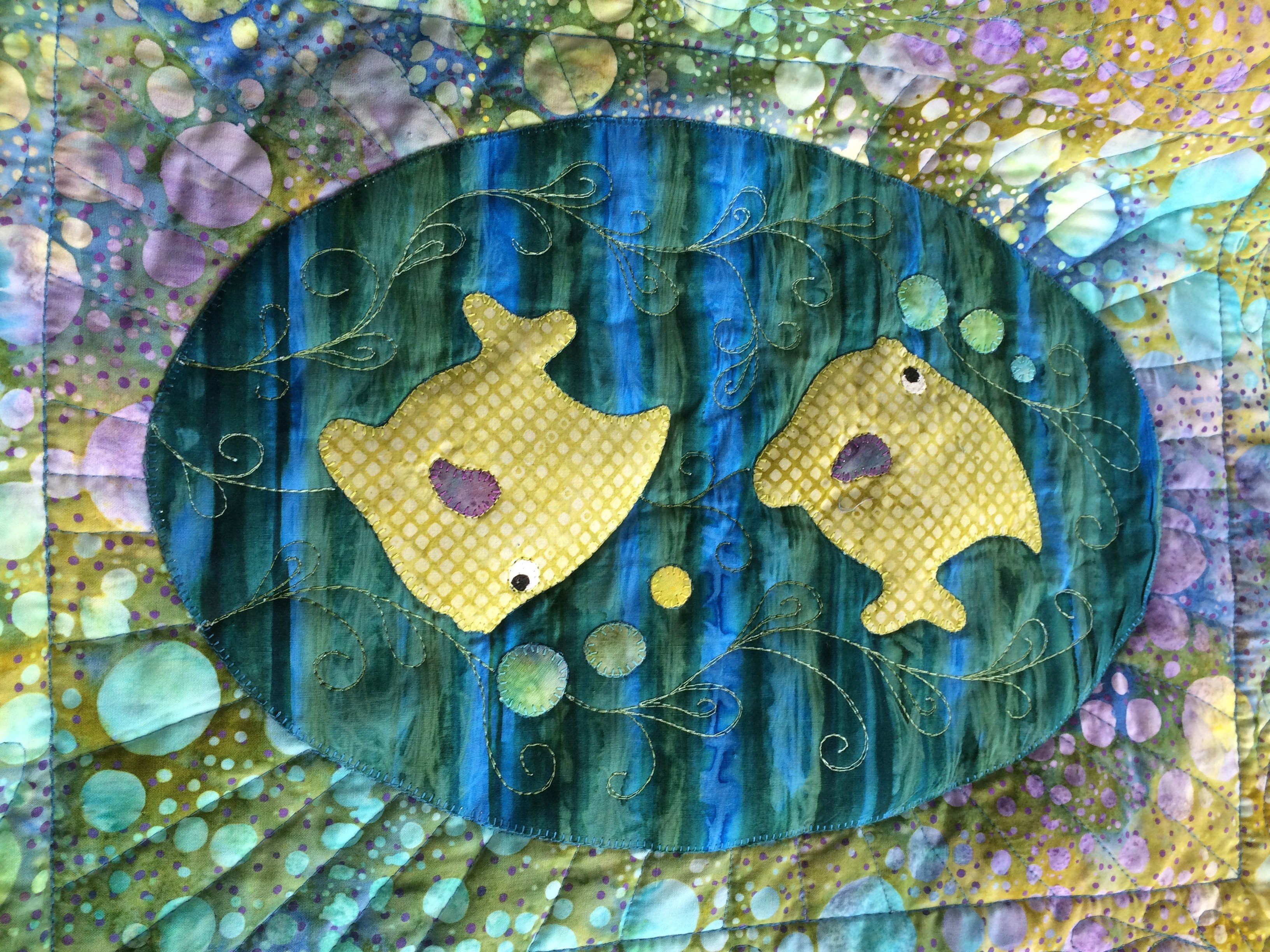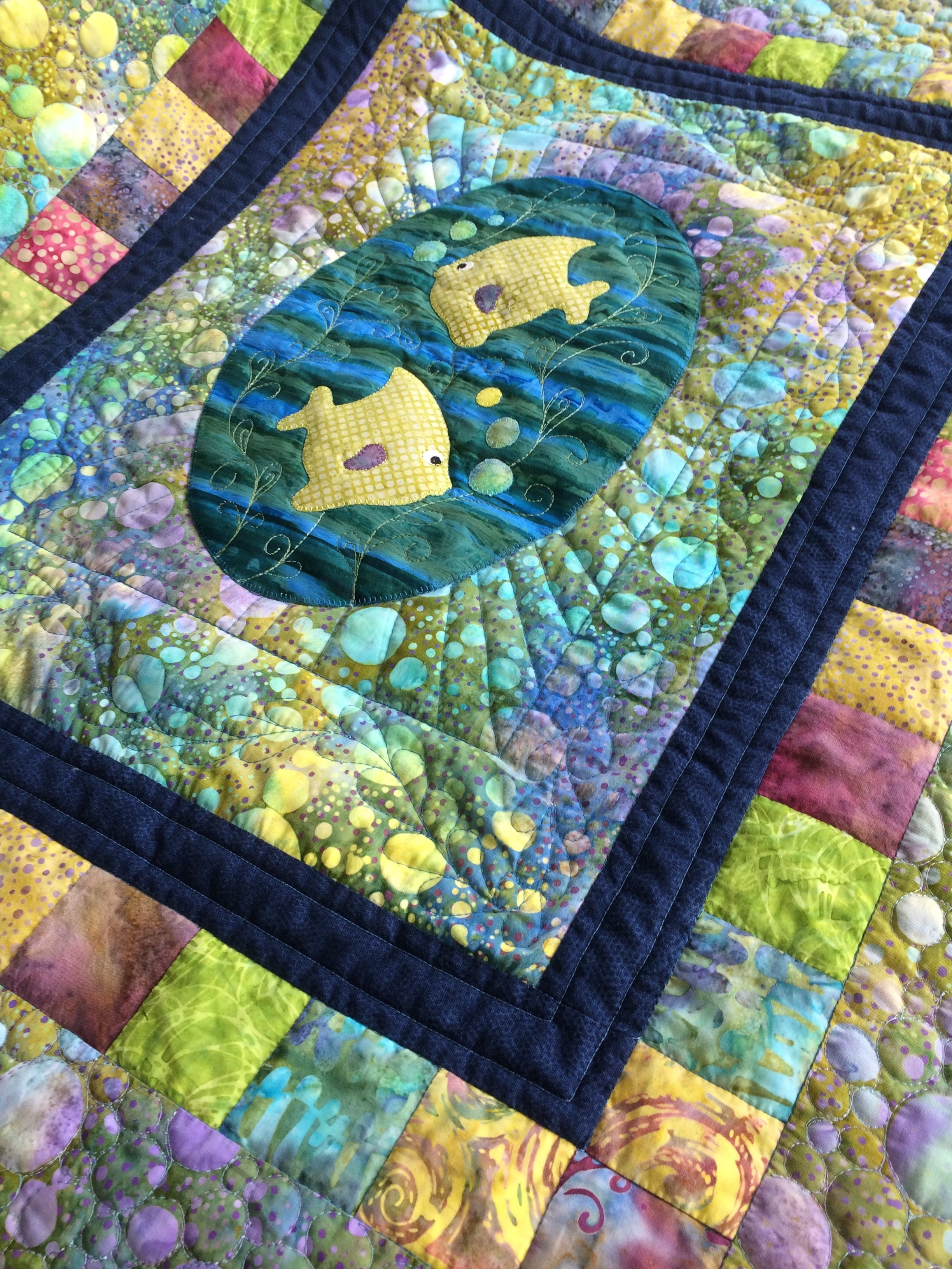 A baby quilt I designed for Baby James using the "bubble" pattern in the batik fabric that I bought in a shop in Texas while we were moving across country from Pennsylvania to Texas. I loved the rich aqua & blues in the 'bubble' batik and decided to save it until the right project presented itself. Not long after we moved in to our new home in Georgetown, we got the news that a family friend in California was expecting their 1st grand baby.