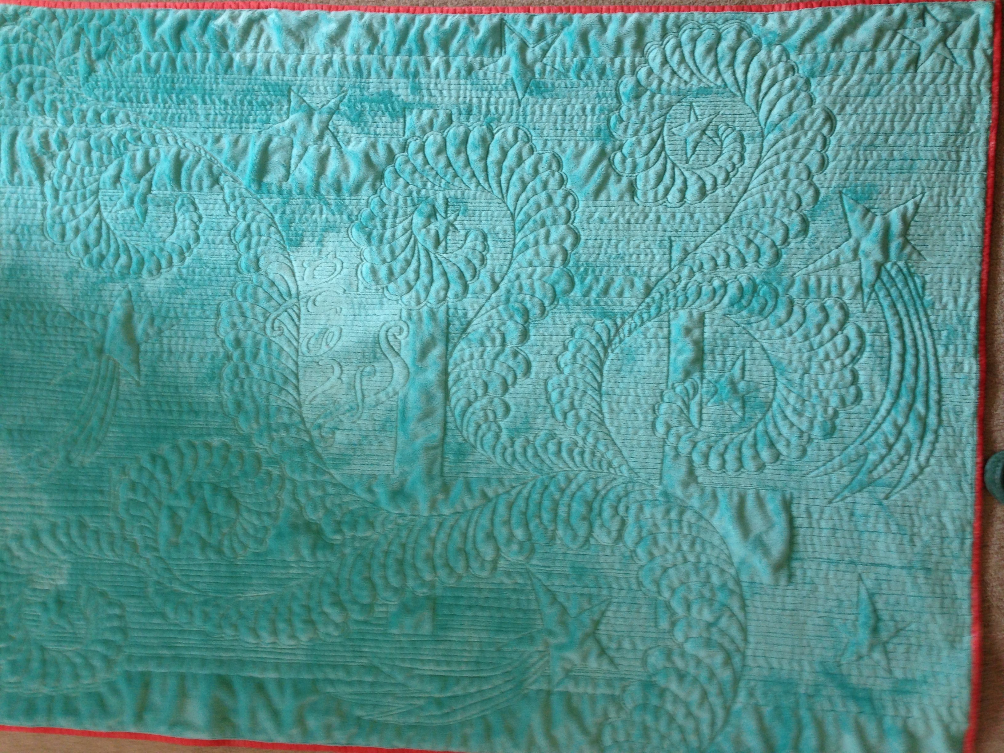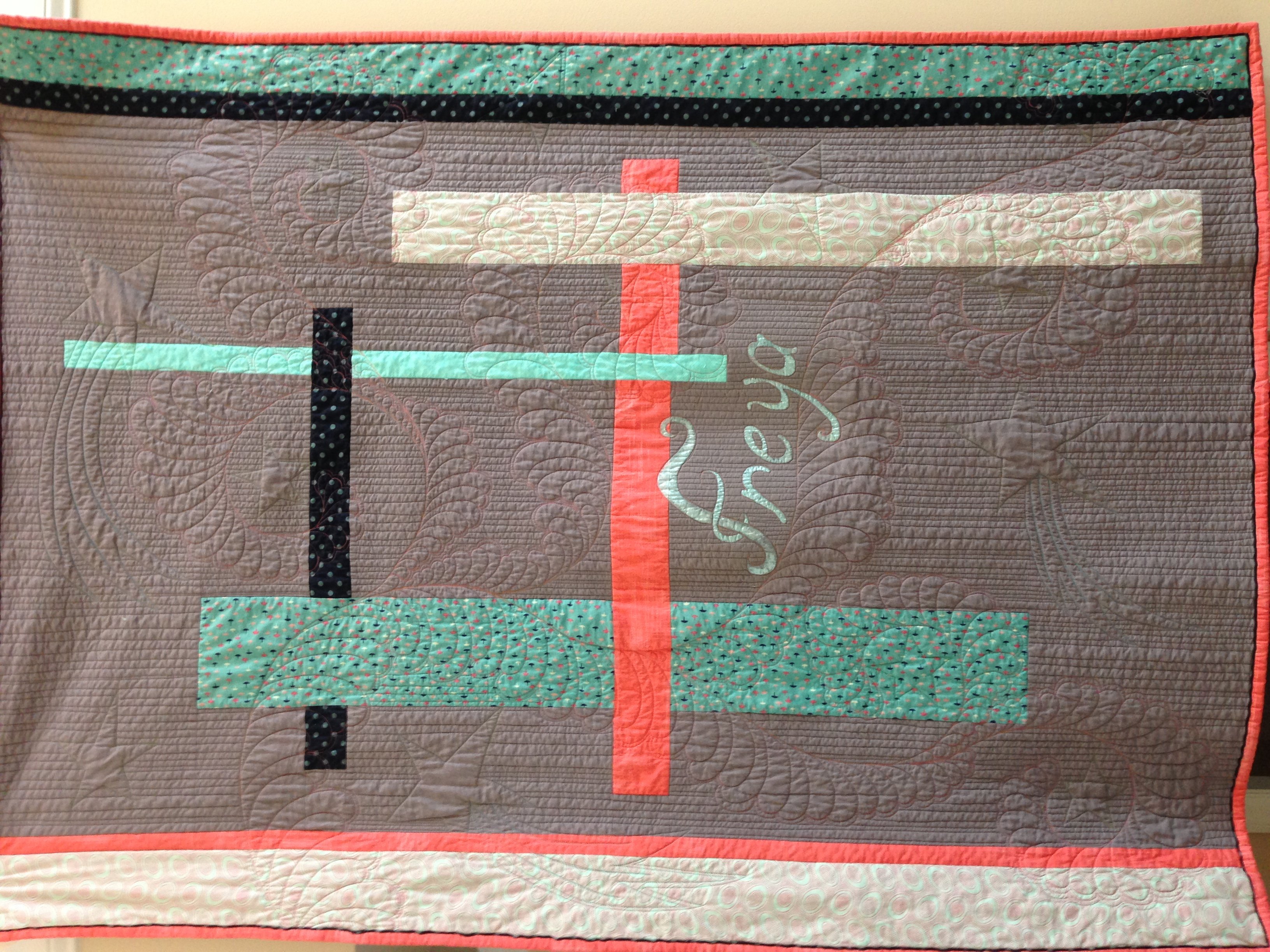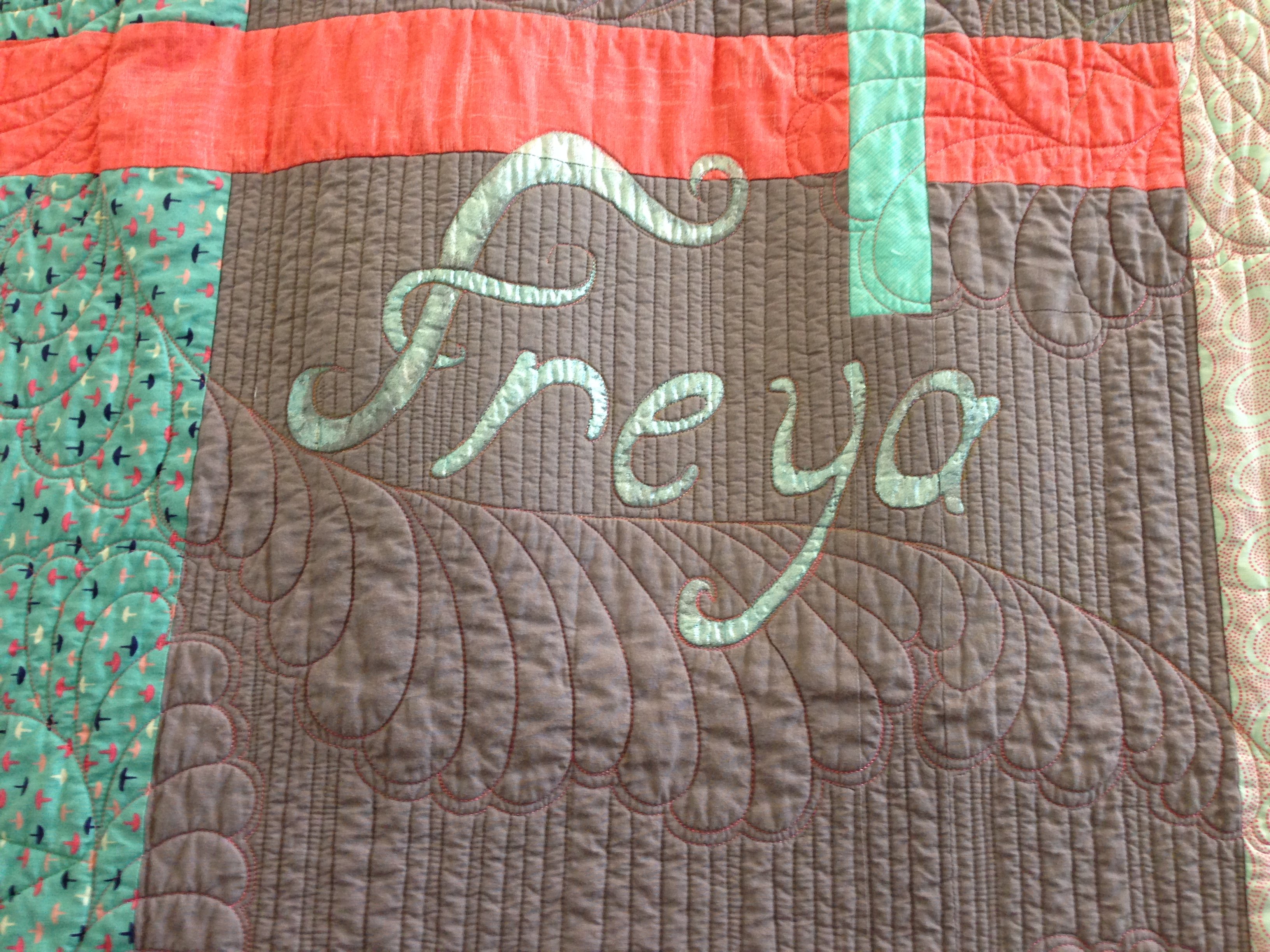 I made this quilt for my niece, Freya. Her mom gave me the color scheme and said she'd like something modern. Since modern quilts are not really my thing, it was a fun adventure and challenge. It isn't truly modern but it's my own design and I'm happy with how it turned out. It has turquoise minkee on the back and I quilted her name before painting with Jacquard Lumiere fabric paints.