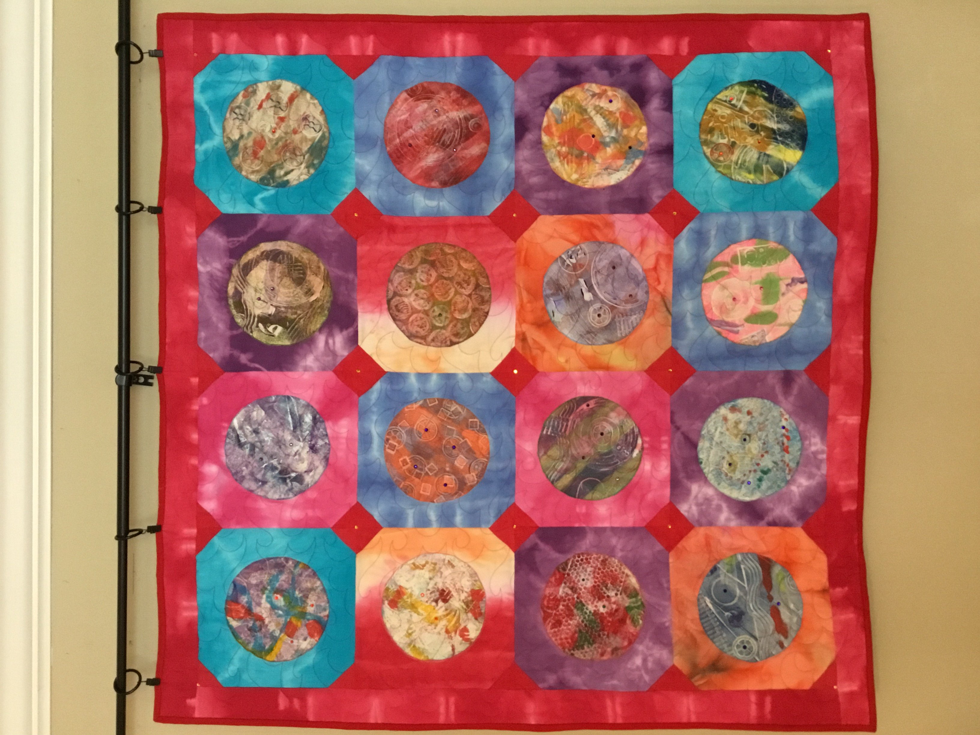 I learned how to make my own cotton fabric using acrylic paints and a Gelli Arts Printing Plate. The round circles are made that way. The outer fabric is hand-dyed. This is an original design for the quilt top and the quilting. The quilt is embellished with colorful hot glue crystals