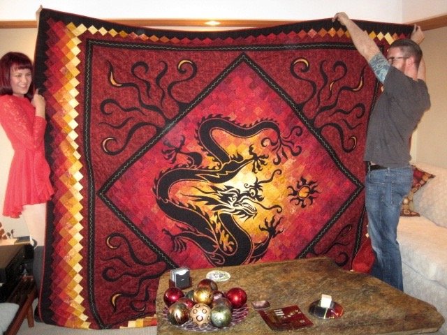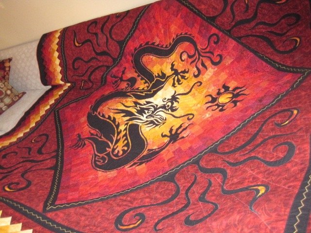For a wedding gift, my son and his wife requested a red quilt with a dragon. This is the quilt I designed for them. It is machine appliqué, satin-stitched onto a pieced background. It arrived about two years late, but they loved it...my daughter-in-law cried when she opened it!