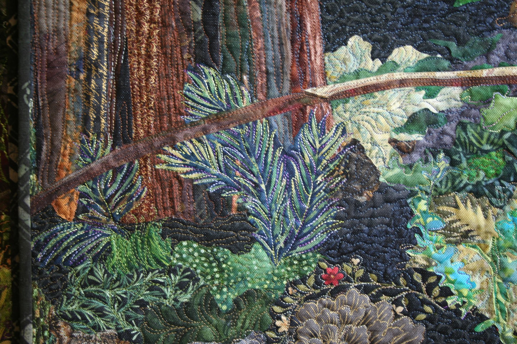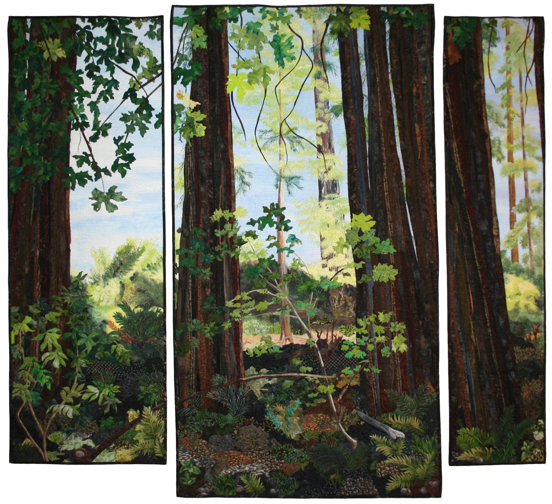 I used to live in Humboldt Co. a few years back & have many treasured photos similar to the scene you depicted in your outstanding quilt. Is that the Eel River in the background traveling along The Avenue of the Giants?