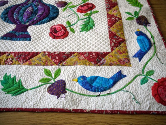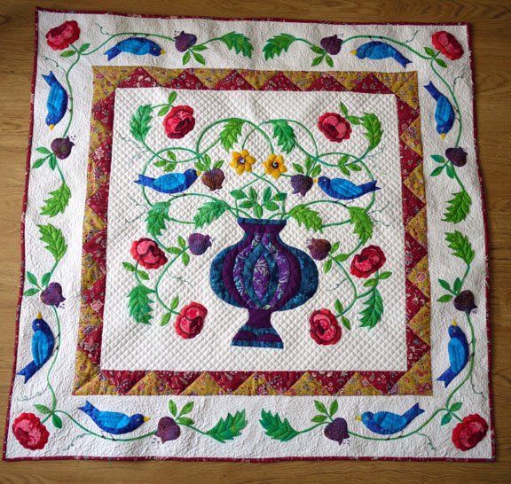 Flowering Urn quilt from the book, Floral Abundance. Hand appliqued and free motion quilted using batiks from my stash and wool batting. I am making a series of seasonal wall hangings to display on my sitting room wall. This is my