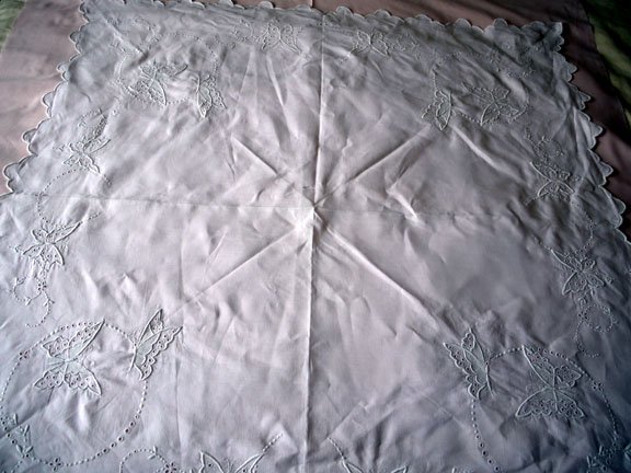 The tablecloth I used for this project was an eBay purchase. It had a hole near the center and looked pretty sorry for itself. It did have some pretty butterfly motifs on it, and as I was trying to teach myself to FMQ, so thought that if it was a disaster, it would not be the end of the world. There was a lot of white space to fill, so I used some Cindy Needham quilting stencils and drew the flowers and vines freehand on the top. I used some purchased lace butterflies to hide the hole in the middle of the quilt. It was great fun to do.