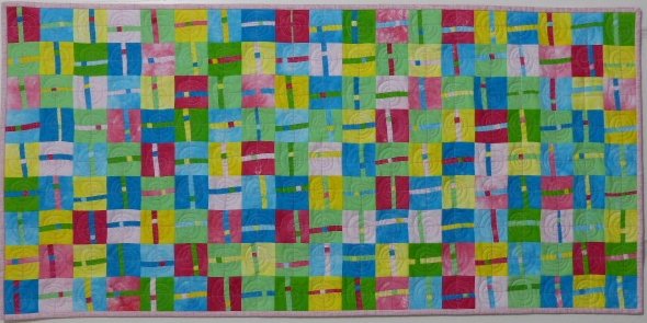 Original table runner using my own hand-dyeds. See companion quilt, Waiting for Spring. Technique for blocks demonstrated by Alex Anderson on The Quilt Show, Episode 910.