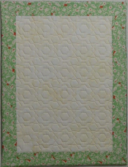 English paper piecing, 1/2-inch hexagons using freezer paper and Crayola template. Papers and hexagons traced and cut out by hand. Started in 2009. Hand appliqued to border; machine quilted around each flower and each center; faced edging instead of binding.