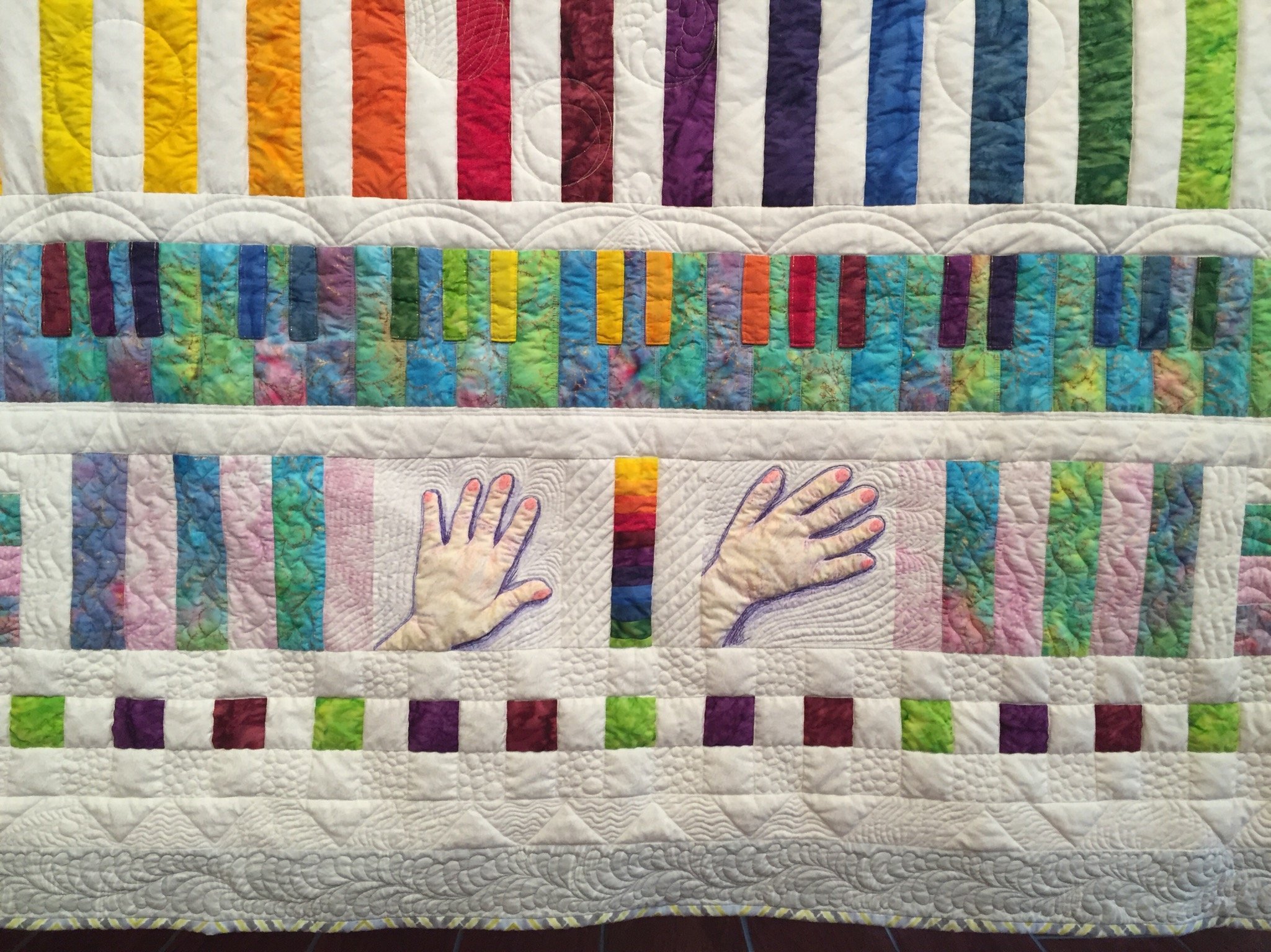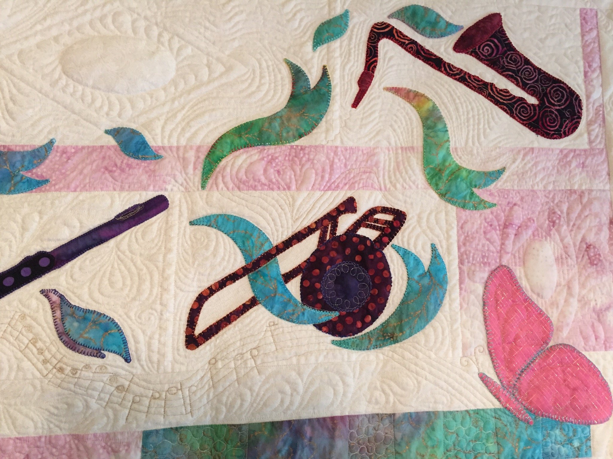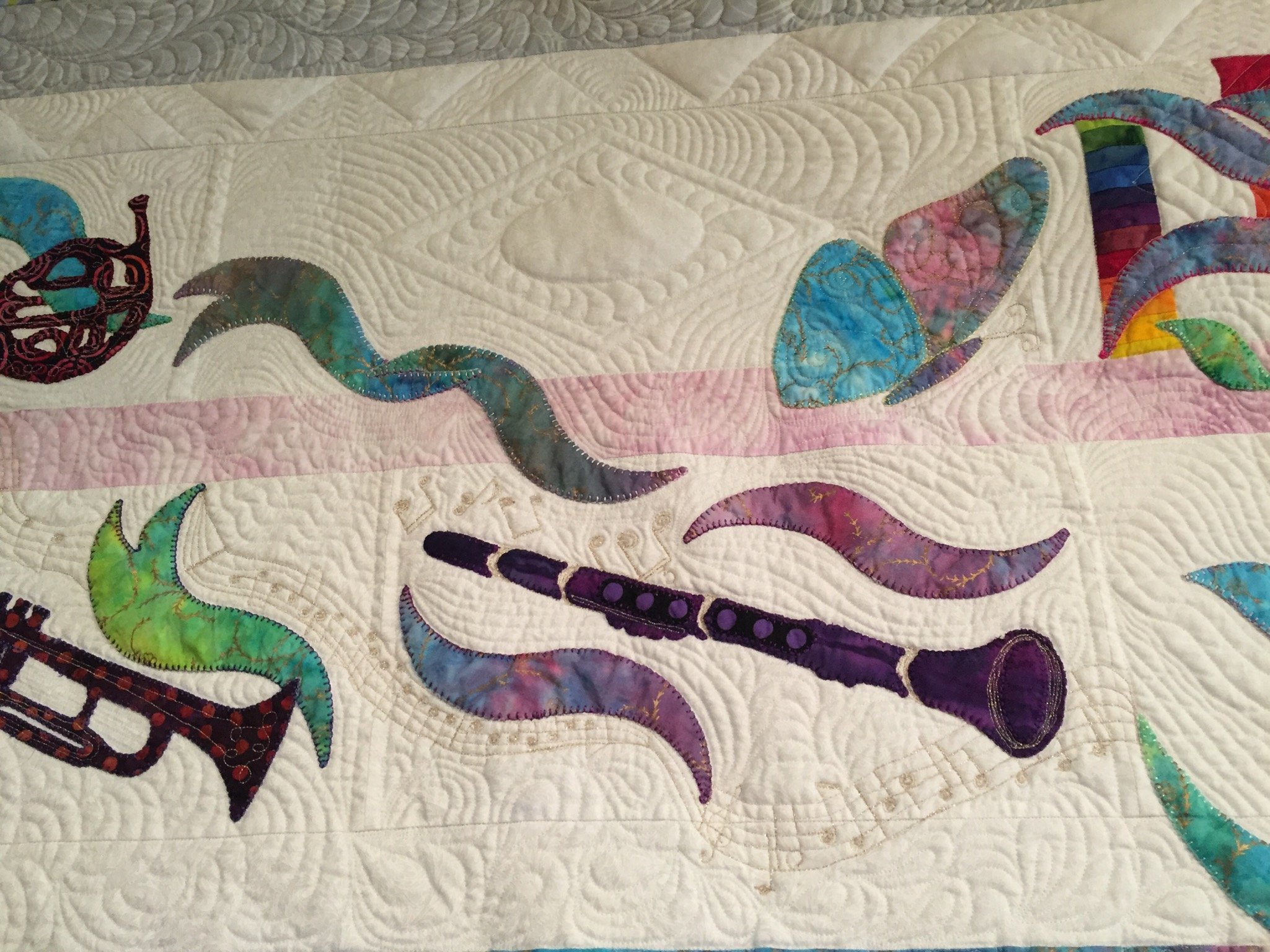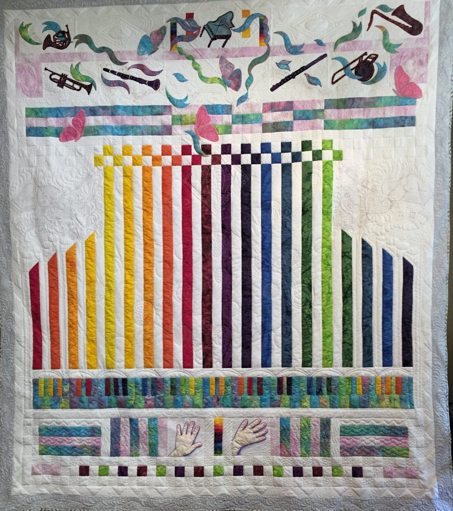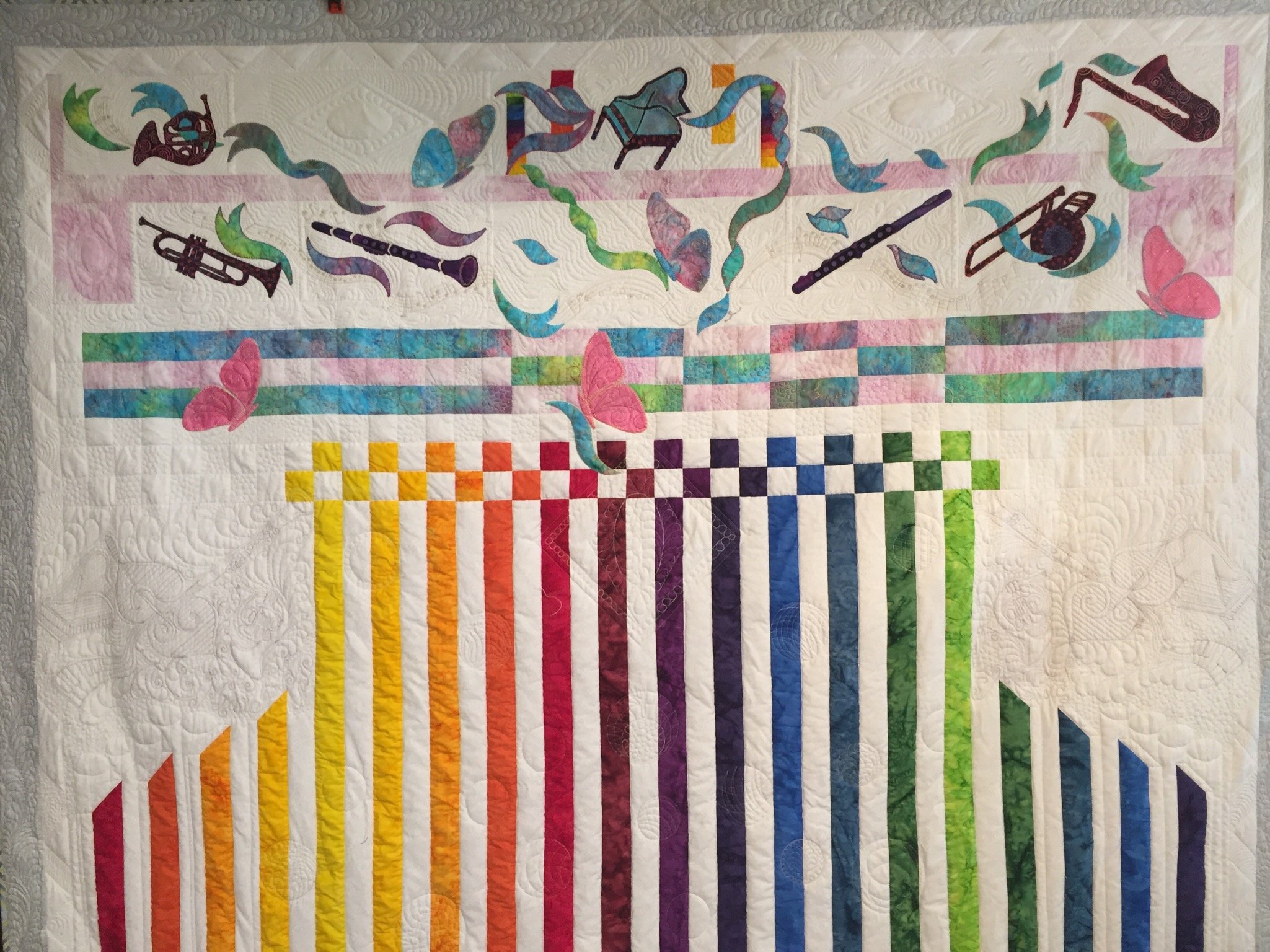 This year long journey started as a challenge to myself to create a modern style quilt and has ended in this final piece. Challenging improvisational appliqué, piecing, and many new techniques were practiced. I have learned plenty, and I'm happy with the final product, but have to acknowledge it is a bit outside the box, especially where traditional quilting is concerned. It is a celebration of my joy in 40 years in church music ministry, playing the organ, singing, and teaching music and band in school.