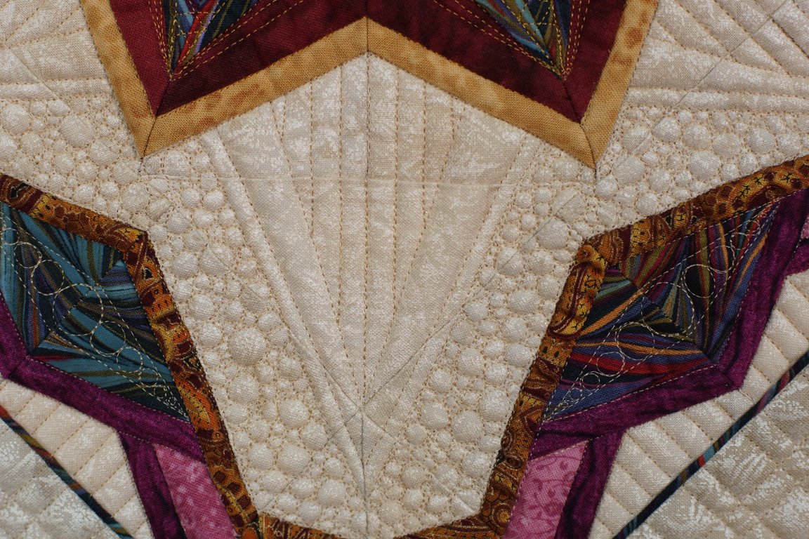 Being encouraged for many years by my husband to design a quilt, I began my adventure. As I designed the center block I envisioned an entirely different quilt…certainly not a center block and 12 circles (each made up of 97 pieces of fabric). Quilting done by Judi Madsen using two shades of Kimono silk thread. Two Battings were used: Hobbs 82/20 and a blended batting of cotton/wool.