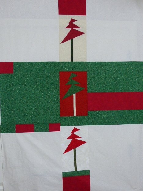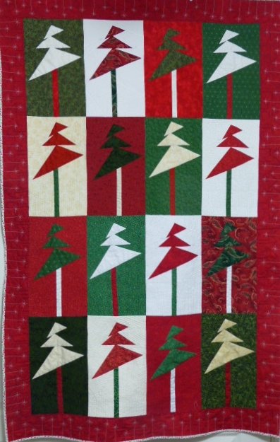 Pieced Christmas quilt. Superior Mono-Poly thread, echo quilting in tree blocks. Star thread (trees) and Yenmet thread (snowflakes), free-motion quilting in border. Pieced back.