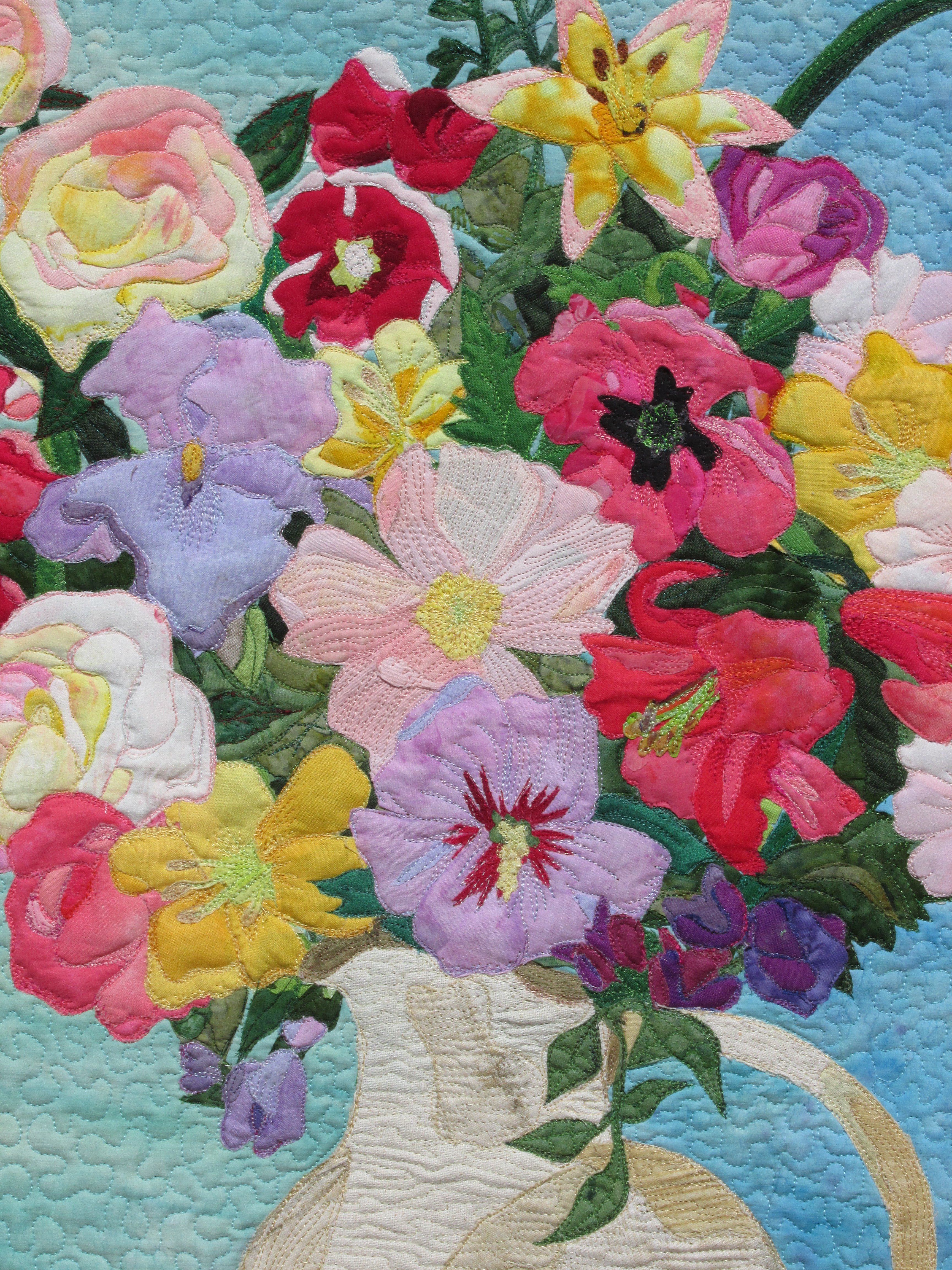 My vase is full of the flowers in my gardens, This wall quilt is raw edged applique. I made patterns from photos I have taken over the years. I hand painted the background fabric. The quilt is heavily quilted with lots of embroidery threads.This was a lot of fun to work on!