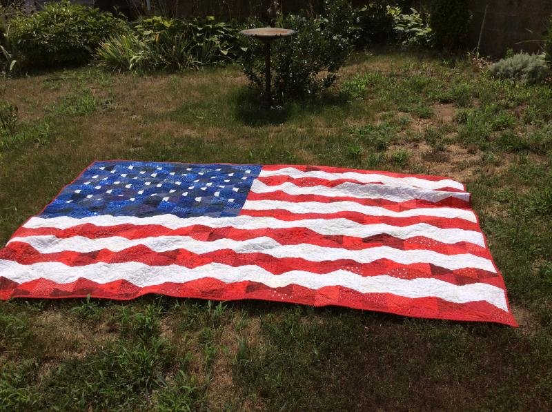 I designed this quilt based on a Missouri Star wall hanging by Jenny Doan. I wanted it to be larger and more accurately represent Old Glory. I used math to determine the best size trapezoid template to give me the overall proportions. I used small white trapezoids to be suggestive of stars instead of using real stars.