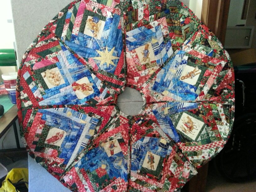 Nativity Tree Skirtthis quilt is an original design tree-skirt, except for the Angels, baby Jesus, etc & etc. It has 8 triangle panels , each having a fabric picture of the typical characters of the nativity scene.