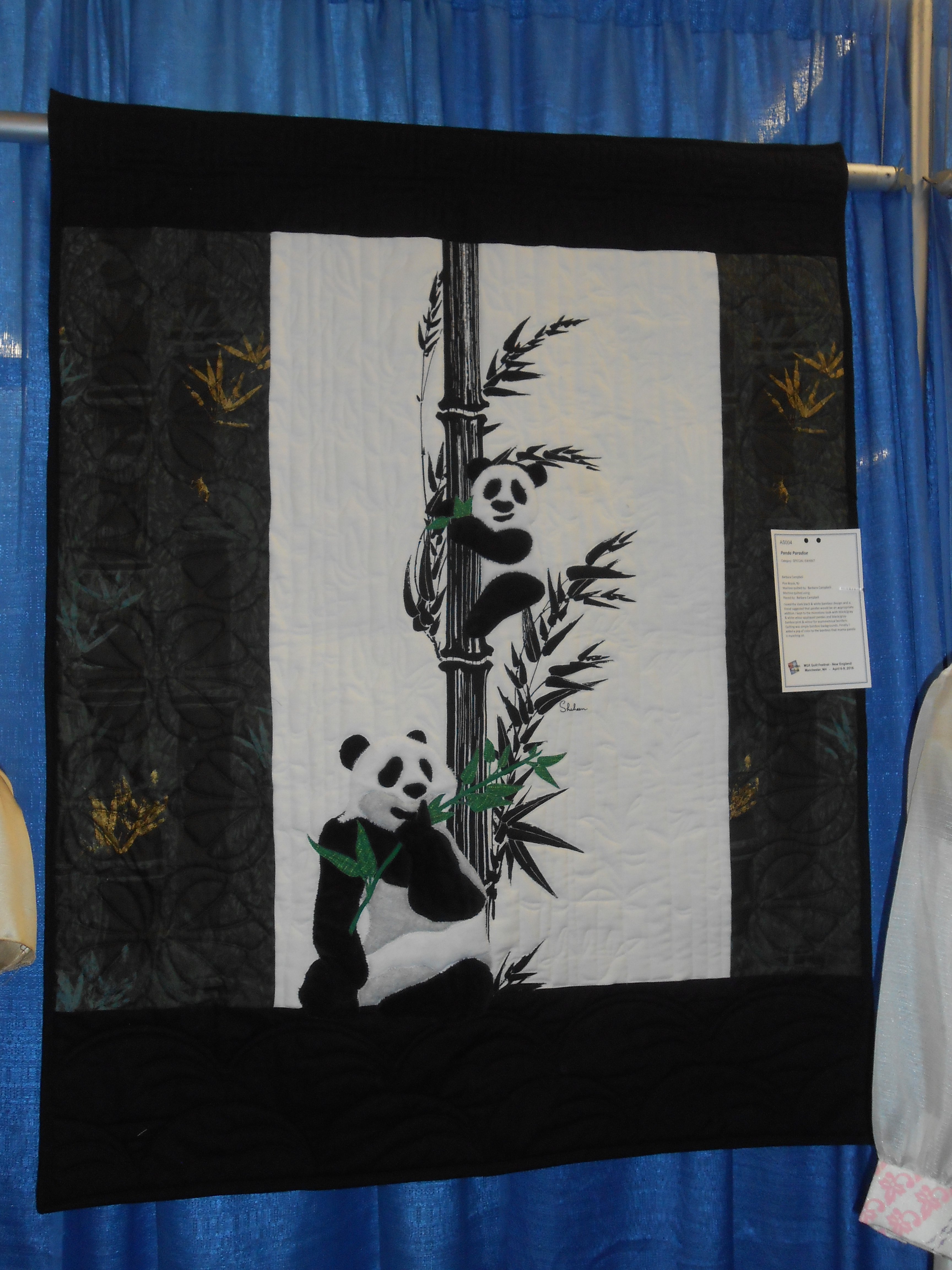 Designed using a panel of fabric designed by Alfred Shaheen. This was done as a challenge for the April 2016 Machine Quilter's Expo in Manchester, NH. The exhibit showcased many different panel designs all quilted and finished differently according to the designer's vision. I chose to applique velour pandas and green bamboo leaves onto the black & white bamboo panel. Background quilting mimics bamboo stalks & leaves. Though I used a preprinted panel, I designed the rest of the quilt.