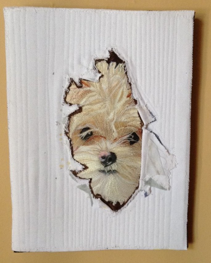 Sophie, breaking through the canvas. Photo of Sophie by owner, Melanie Smith (used with permission). Photo transfer,thread painting, fabric paints, quilted by machine. Applied to wrapped canvas.