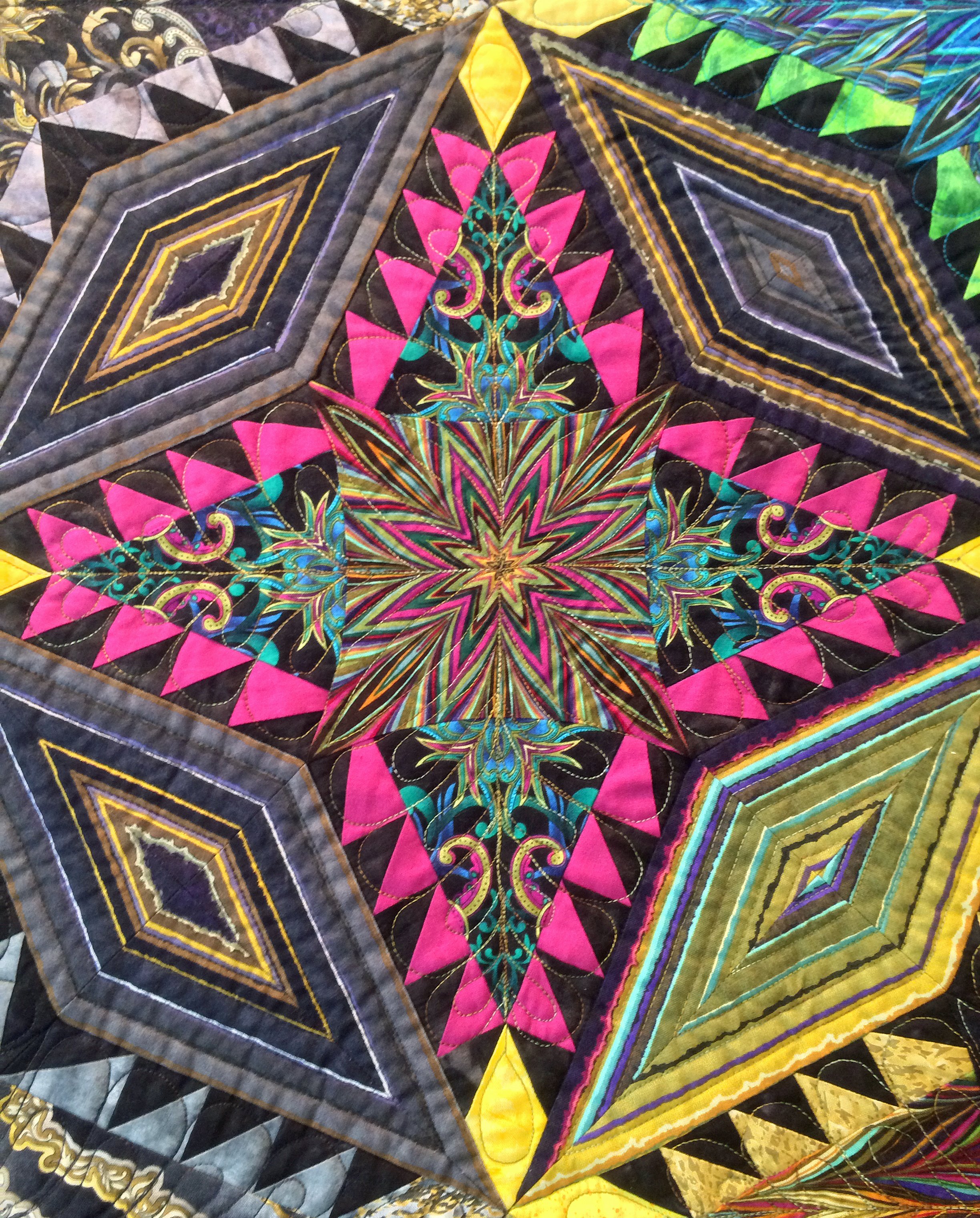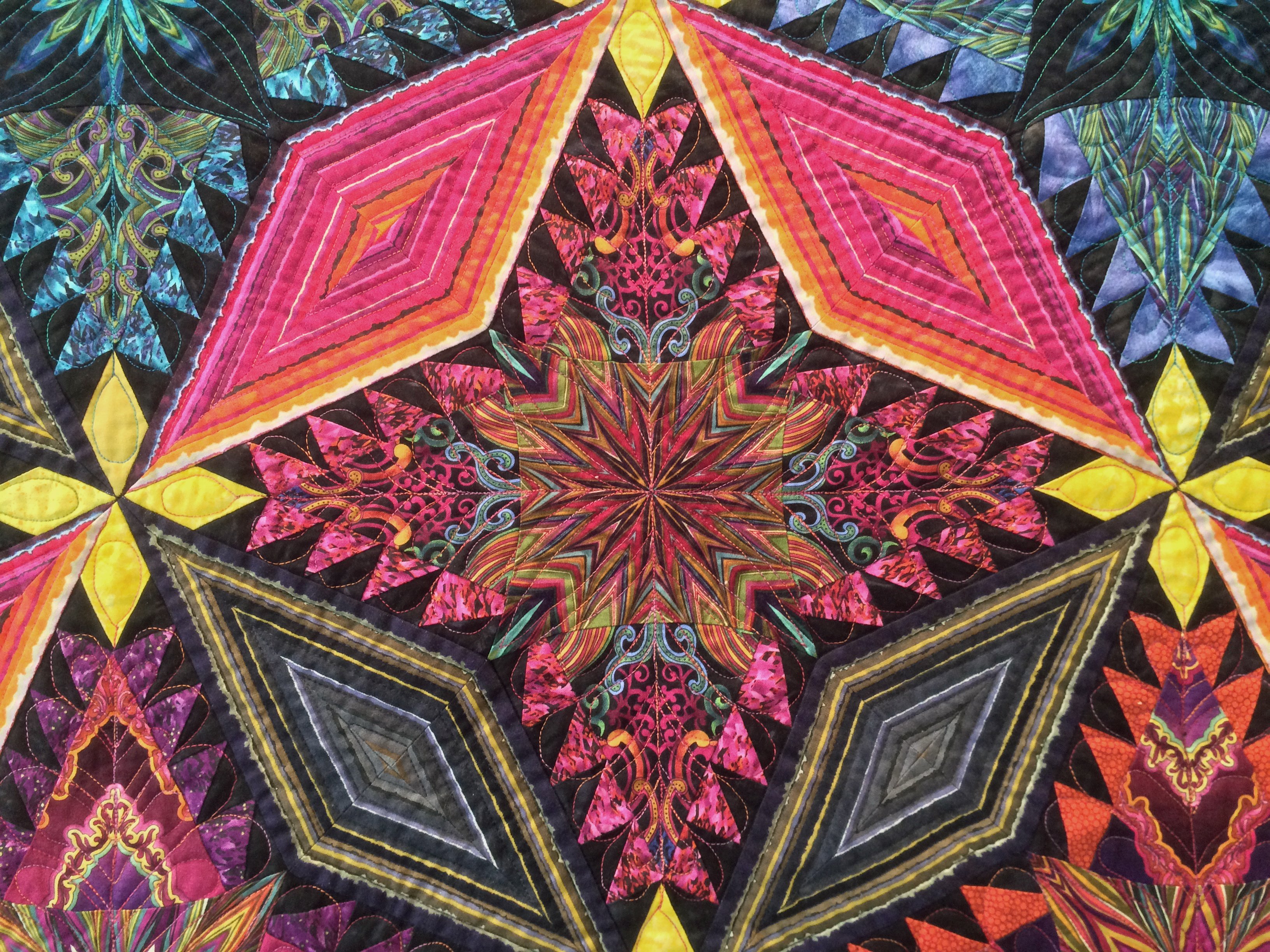 This quilt is adapted from Tomoko Tohno’s “Orange Range” pattern, and draws on my beautiful (but out of print) collection of Paula Nadelstern “Opulence” prints. While Tohno’s blocks had pieced centers, I redrafted the pattern so I could feature the radiating medallions, as well as the different colorways, within the limits of my available stash.