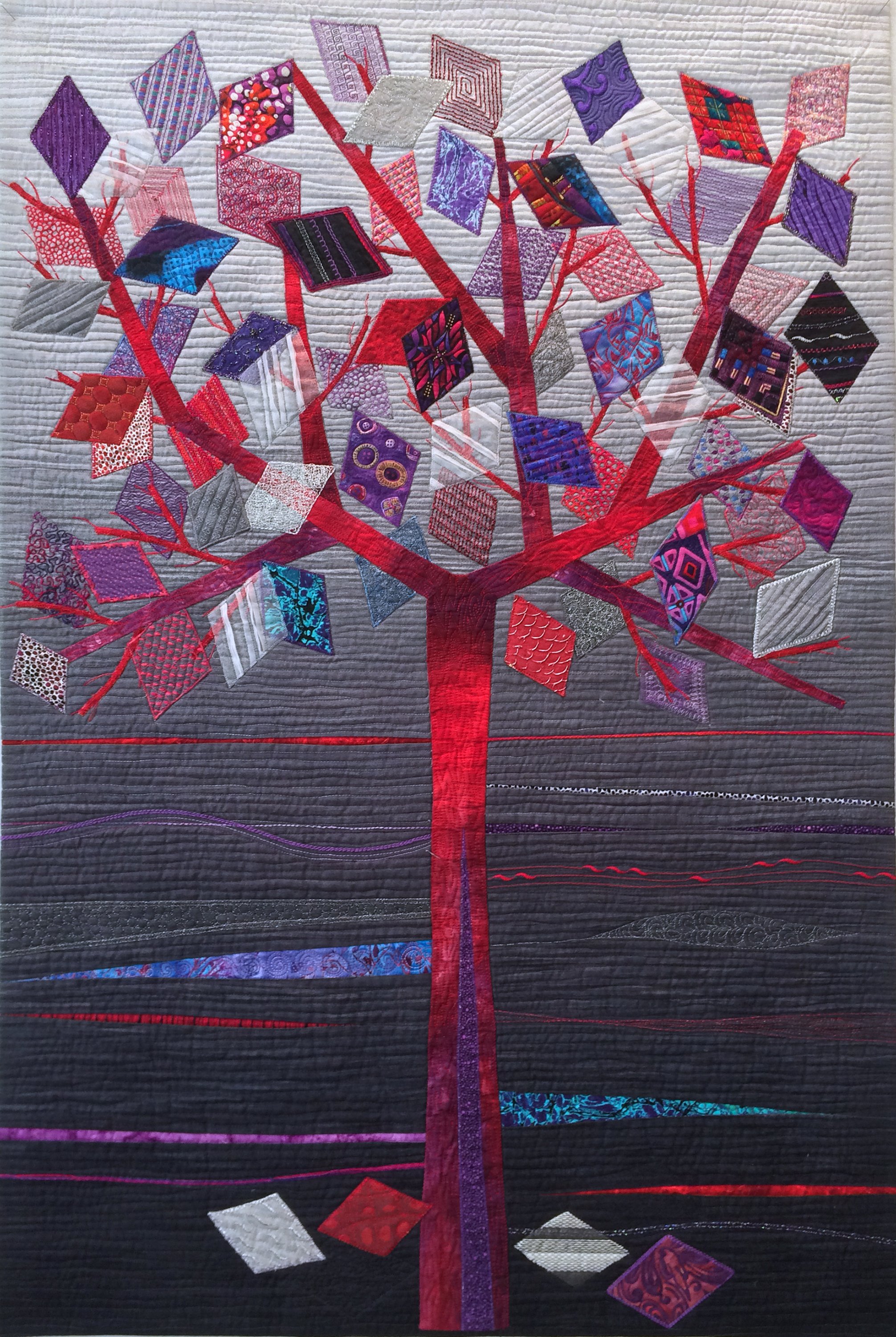 Approaching an opportunity to retire (and the age for wearing purple and red!), I realized that life is really a series of decisions. Some have trivial consequences, while others are more significant, each an opportunity. Every "leaf" on the quilted tree represents a decision or opportunity.