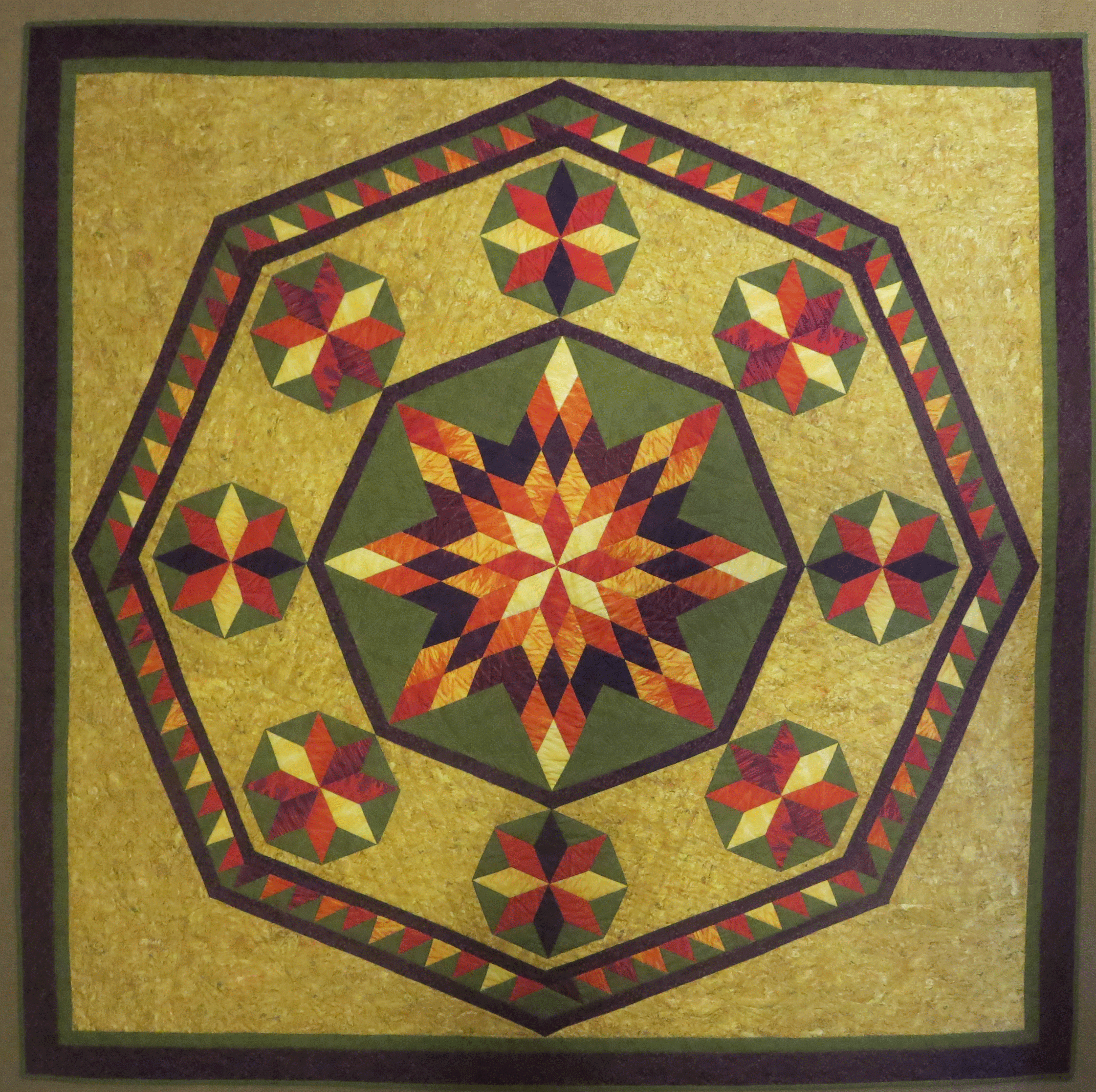 This quilt began as a tribute to the Lone Star quilt that started my passion for making quilts. About 30 years ago, I walked into Eddies quilt shop in Edina, Minnesota with a piece of fabric I loved and a picture of this Lone Star quilt I wanted to make. I was as novice as one could get. The kind person at the shop, introduced me to the world of quilts by suggesting i might enjoy taking a sampler quilt class they had. This was before rotary cutters, paper piecing and the multitude of wonderful rulers that assist us in creating and designing the quilts of today. Needless to say, I signed up for the class and thus began my life long journey and passion for this world of quilts and quilters. 30 years later, I still had never made a Lone Star quilt. The one that had sparked my passion for quilts! This quilt has the Lone Star that started my journey.