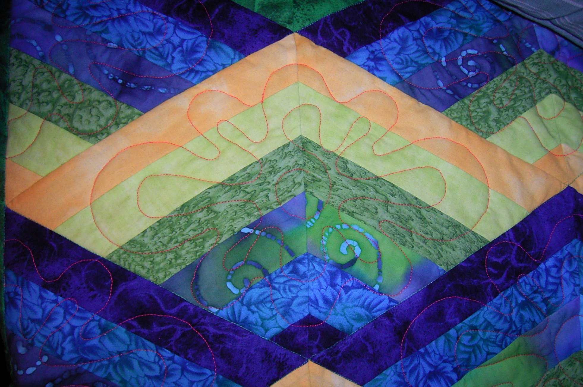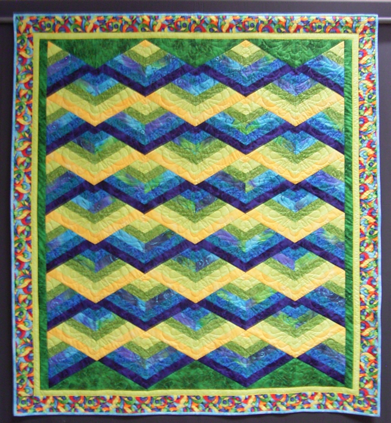 Made in Chris Timmins Take Six class in 2012. The first of my tops quilted on my new Sweet16 this year, in time for our guild quilt show. The name "Nimbin" reflects the rainbow colors, and refers to the "hippy" community of Nimbin in Queensland.