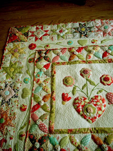 This quilt was total serendipity. It is made from the scraps from another quilt - mostly Moda Fig Tree. I love hand applique, so I started out by drawing the central motif and then just added additional borders to the quilt. I adore Ohio Stars and Orange Peel blocks, so added those, as well. There was no planning involved, I am embarrassed to admit - the quilt just happened. I added buttons and yo yo embellishments. As the quilt is so busy, I decided to keep the quilting simple. It will probably not be everyone's cup of tea, but looking at it cheers me up!
