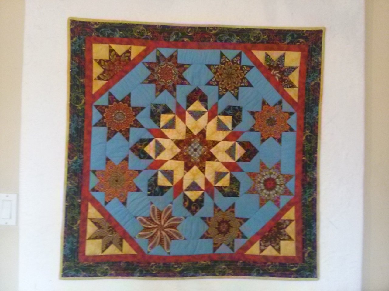 I made the quilt for my son who moved into his first apartment. It is a reduced size version of the center of a larger quilt I am hand quilting. The stars around the center were fussy cut from one yard of fabric. I was bothered by one of the stars that stood out from the others. I didn't have enough fabric to make another 8 pointed star. Should I find and buy another yard? That star represents how different we all can be. I am proud of my son and his unique qualities. "Dare to be Different" is my gift to him as he moves forward.