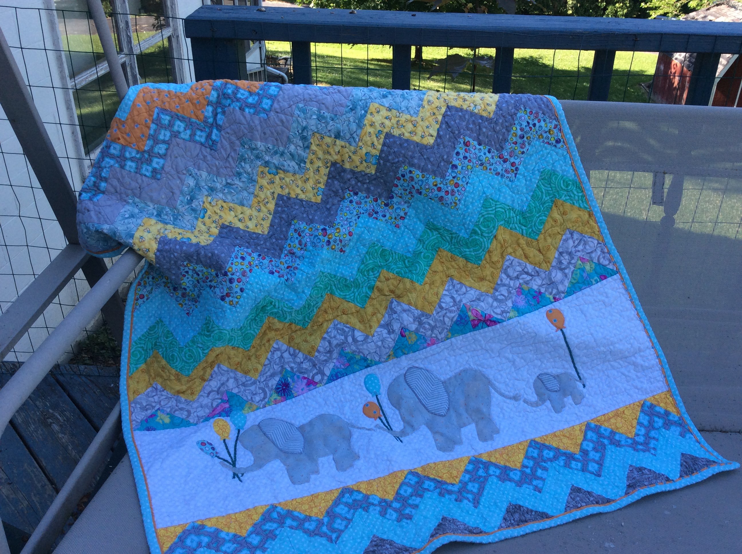 Made for my great grand daughter Natalie Rose. The nursery is decorated with safari animals in gray, yellow and turquoise, so planned the colors and theme to match. Inspired by a pattern by Mommy and Me. Drew the elephants and used Zig zags rather than square blocks.