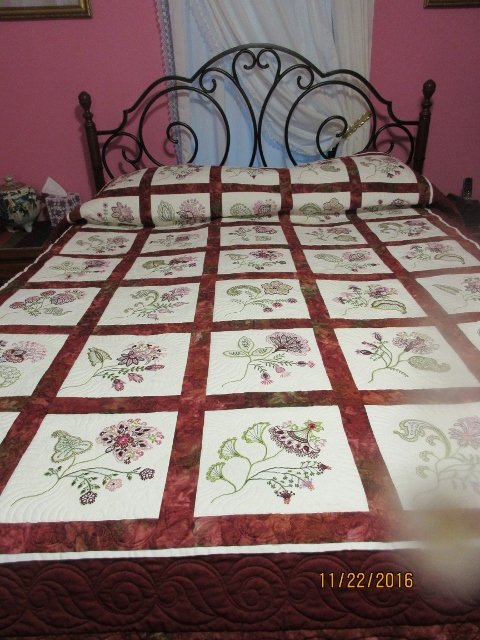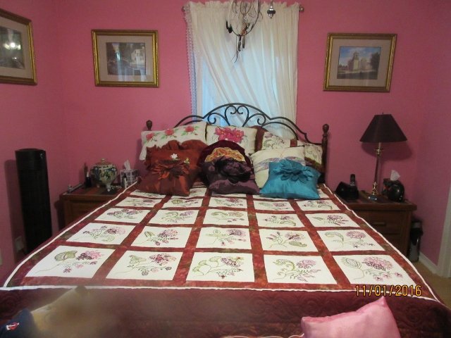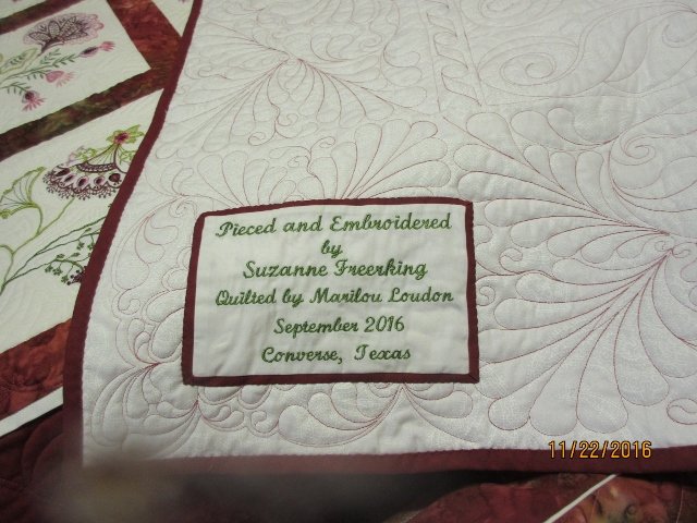 My first quilt. Machine embroidered and pieced by Suzanne. Took almost a year but now on display in our room. Loving the quilting by Marilou. Instructor, Cyndy of Grome's in San Antonio. So worth the time and money. On to our next adventure. Thank you for allowing me to share our new quilt baby addition.Tessa