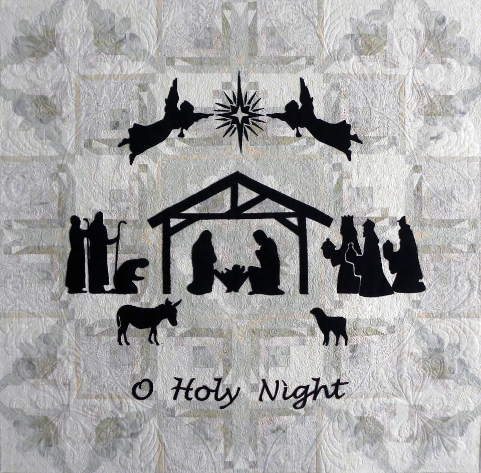 O' Holy Night was my 2012 Christmas quilt. The background was paper pieced and then the manger scene was appliqued on top of the background. The pieced background is a miniaturized version of a pattern by Pam Bono called "Daisies in the Cabin" The original quilt pattern finished to 102" but I wanted it to be a wall quilt for my entryway. I reduced it down to 45" so it would fit on the wall space perfectly. I selected varying values of sage green and cream batiks. The applique is raw edge fusible using Kona cotton. It was one of the first quilts I quilted on my Gammill. It is quilted with Superior So-Fine in both the top and the bottom. May the Christmas season be filled with the joys and miracles of the season.