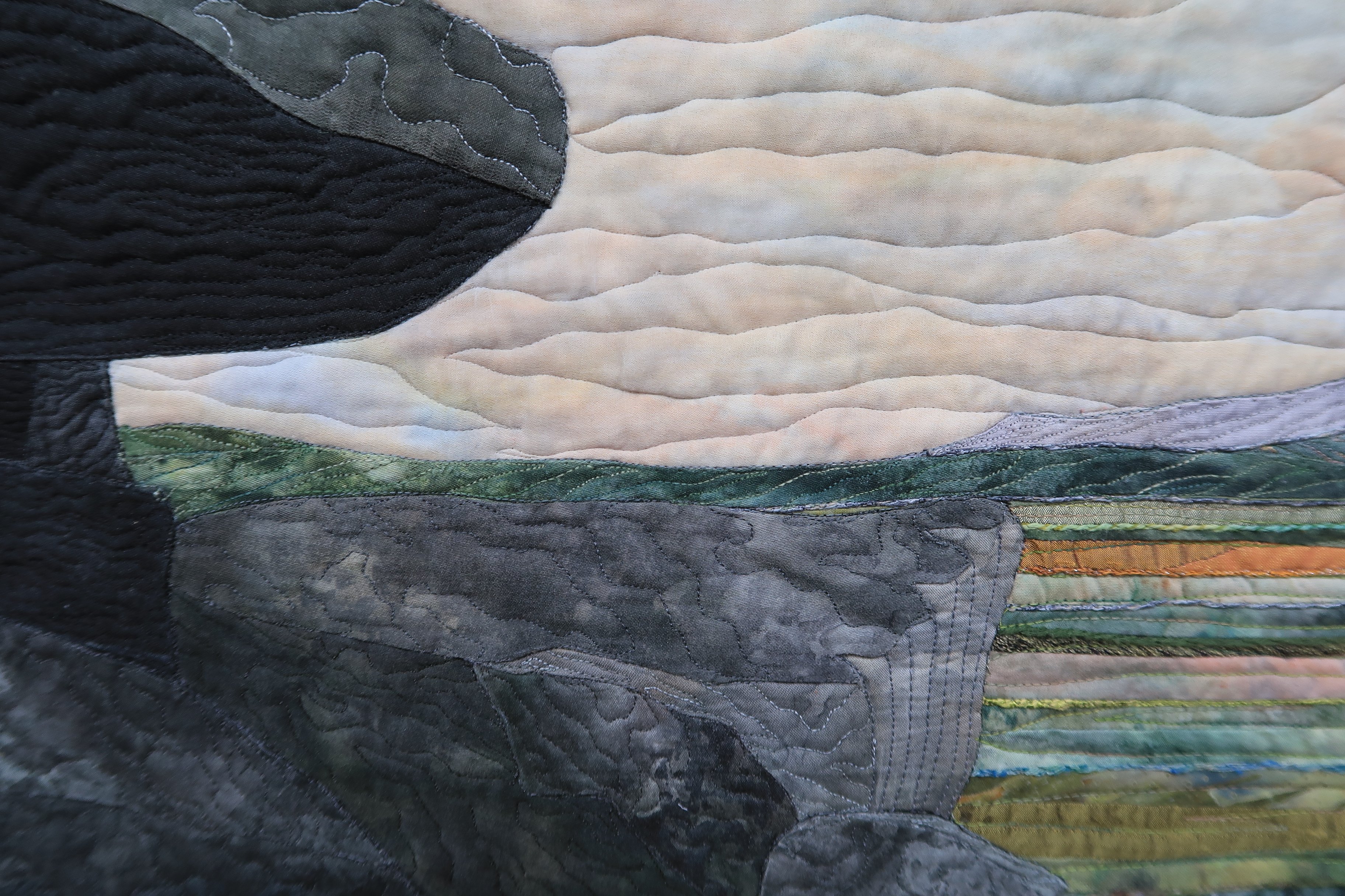 The inspiration for this quilt is a magnificent dolmen, Kilcooney Dolmen is located near a small village of Ardara, County Donegal, Ireland. The fabrics are mostly my hand-painted cottons, hand painted silk organza, and couched yarns and trims. I typically paint mostly fat quarters, then each stone cut and appliquéd. There is strip piecing, and turned edge appliqué, and free motion quilting. The edges are faced.