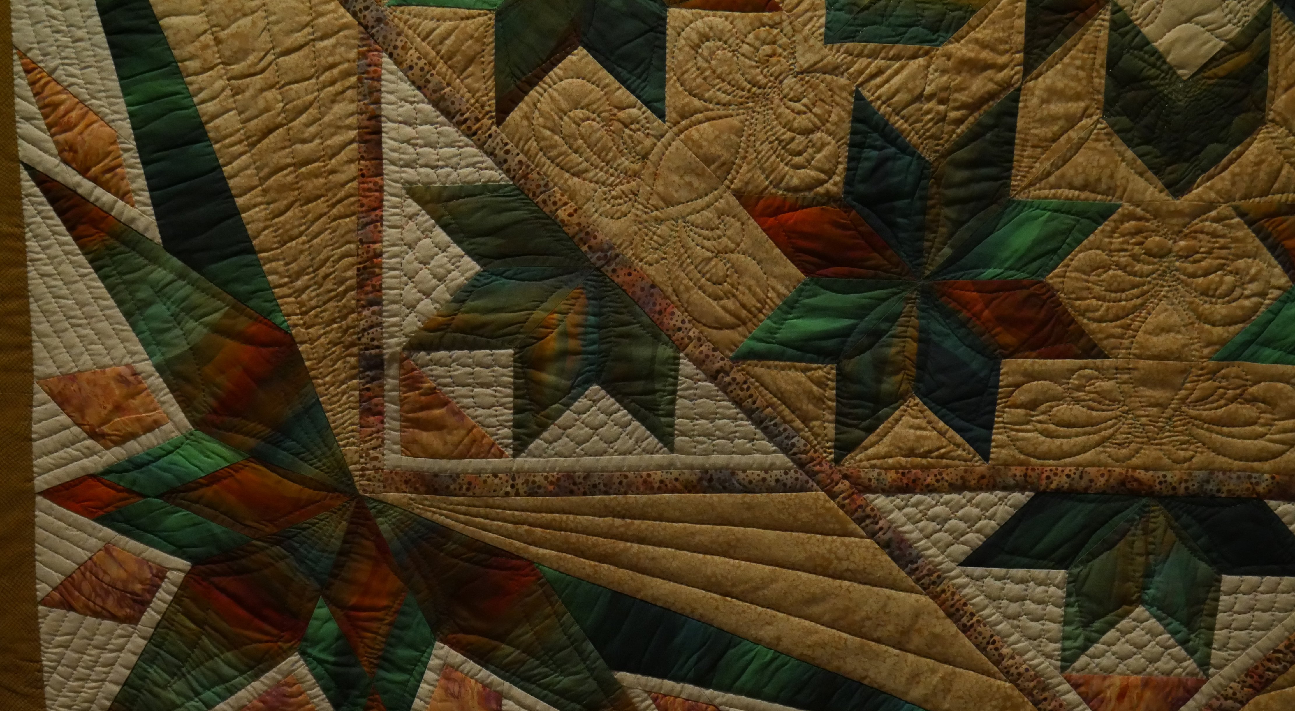 Medallion quilts are, for me, the perfect medium to expand on an idea throughout the process of designing and making the quilt. I could have stopped at many points in this quilt and decided that is what I want to make. This quilt started with a Hoffman digital print fabric I found and loved during my areas "Shop Hop" 2016 that inspired me. I had just finished a Lone Star medallion quilt and was inspired by the many possibilities of Lone Star variations. When I was done piecing it, it reminded me of a peacock in full plumage. That was then the inspiration for the quilting I did on it. It's my "Y-seam quilt", lots and lots of Y-seams went into making this.
