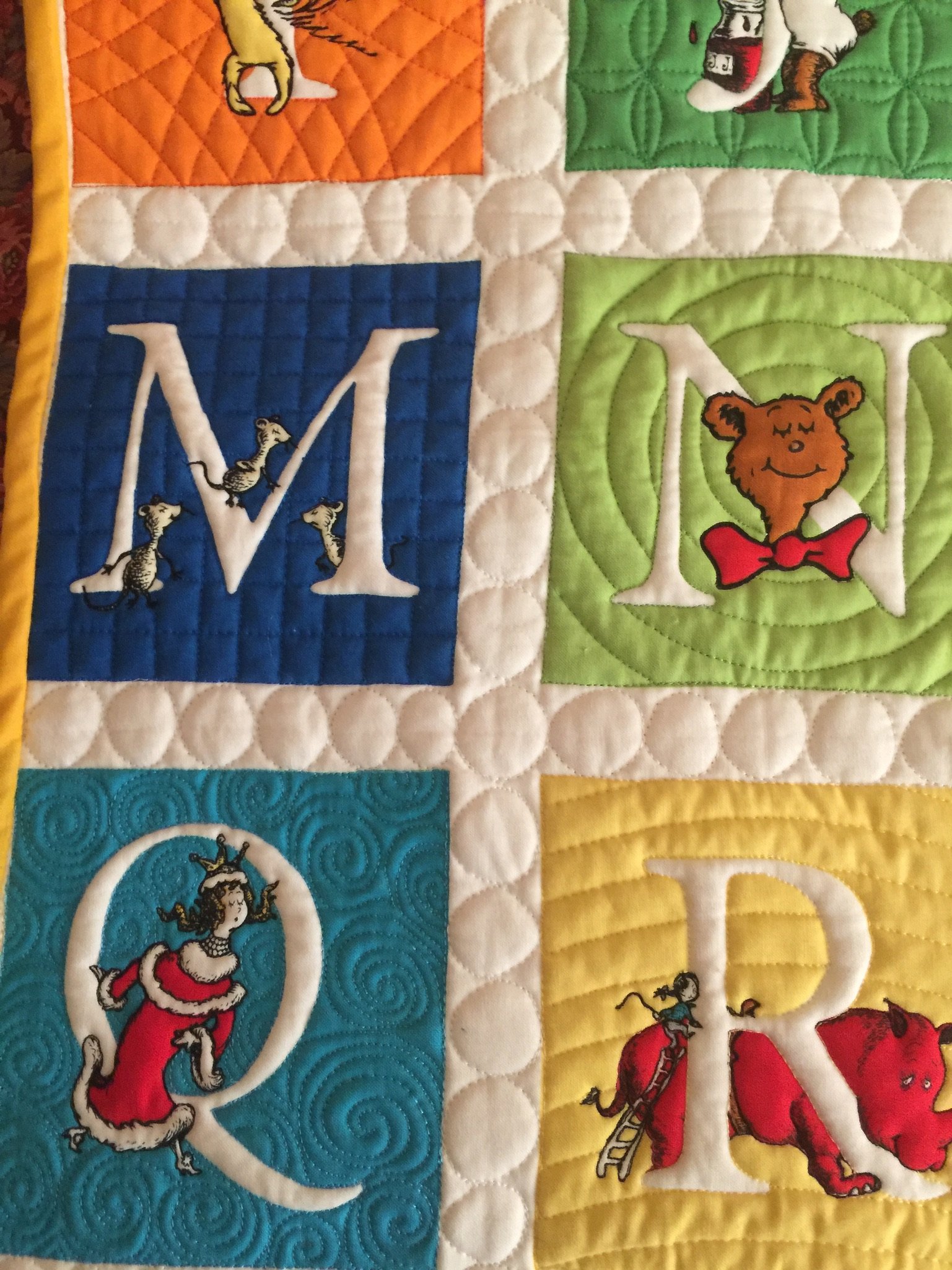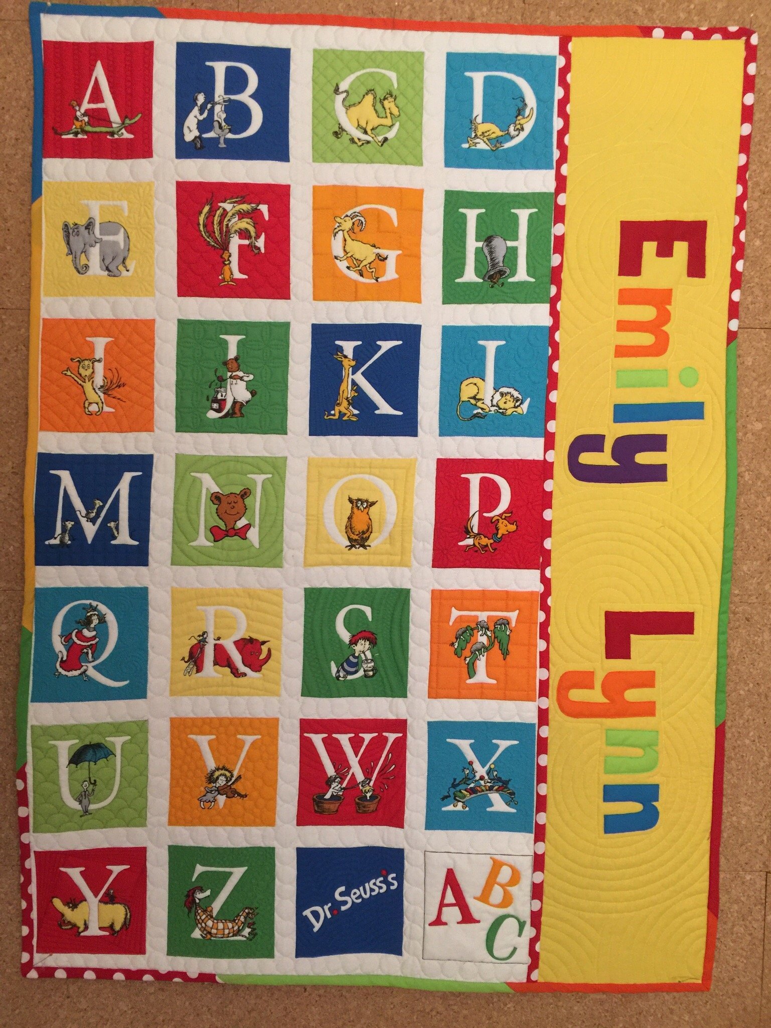 Started with a Dr. Seuss Alphabet Panel, that was quilted using a mix of ruler quilting and free motion quilting (on a domestic machine). Then I removed the binding, and added a section with Emily's name, using fusible applique, and joined both sections using 'quilt as you go' technique.