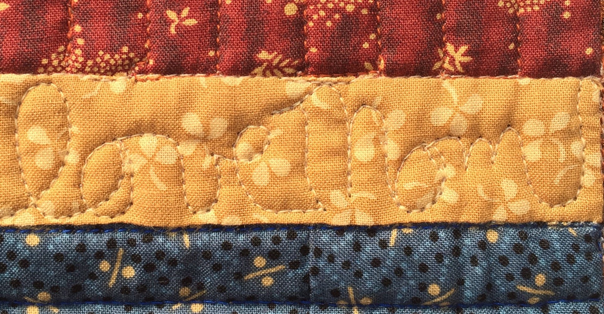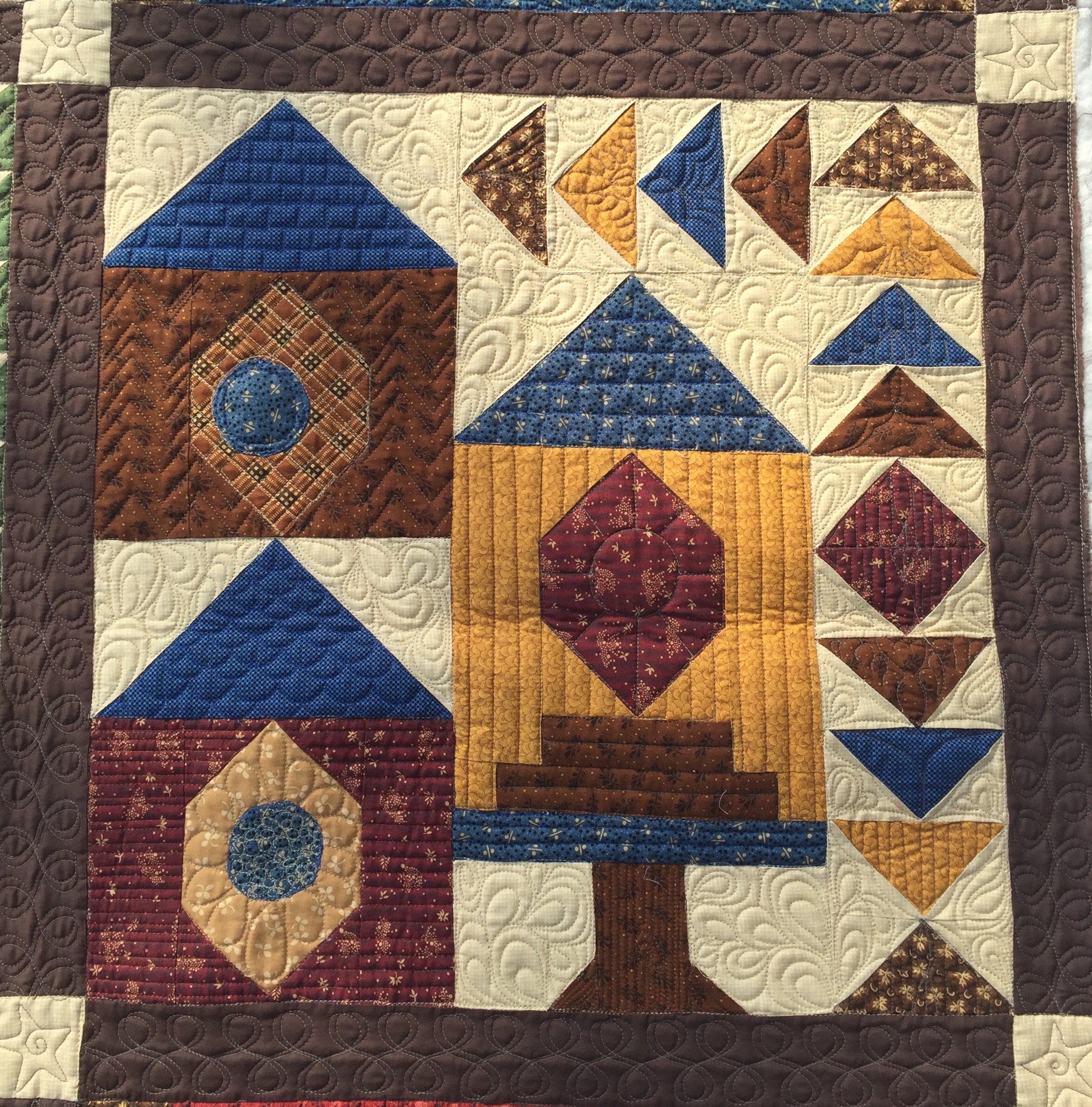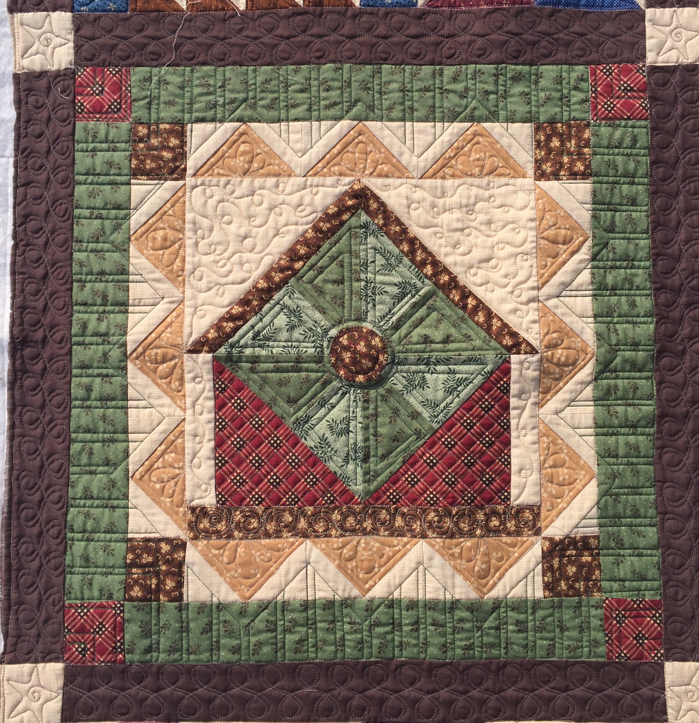 Customer quilt. I quilted several quilts for a family who lost their sweet aunt this past spring. She was making a quilt for each of her children before she passed away. Her niec-in-law finished piecing them and I was honored to quilt them all. In each quilt I quilted a hidden "Love, mom". They didn't know the name of this pattern and after much research, I found it to be a 2000 Thimblberries "Safe Haven" BOM! Here is the quilt ready for binding.