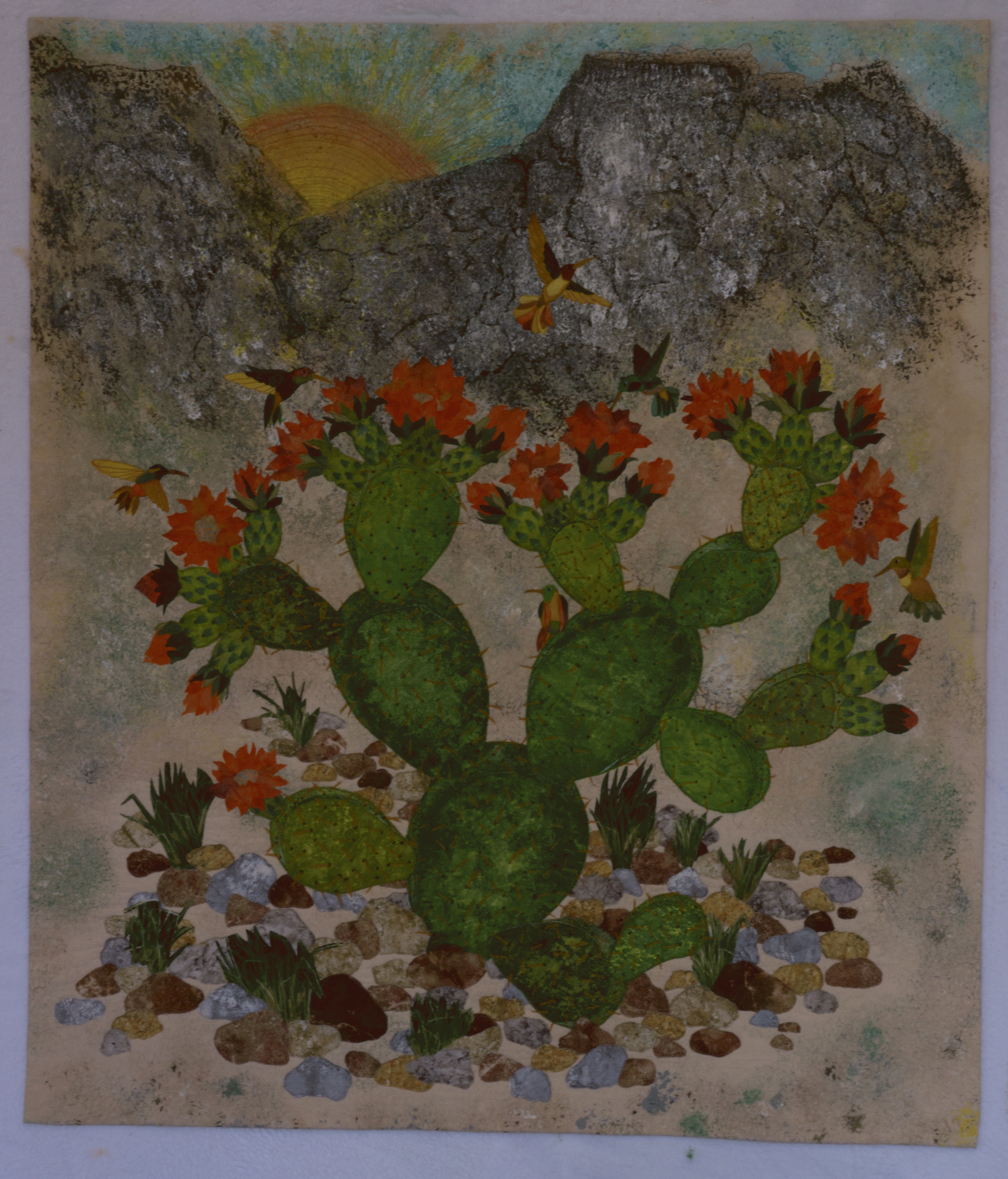 I made this for my brother and his wife who are "Snow Birds" in Arizona during the winters in Minnesota. I ventured outside my comfort zone of traditional quilts to make this landscape quilt. No rules were needed here. I used paint, fused fabric, machine embellishments and free motion quilting to complete the quilt.