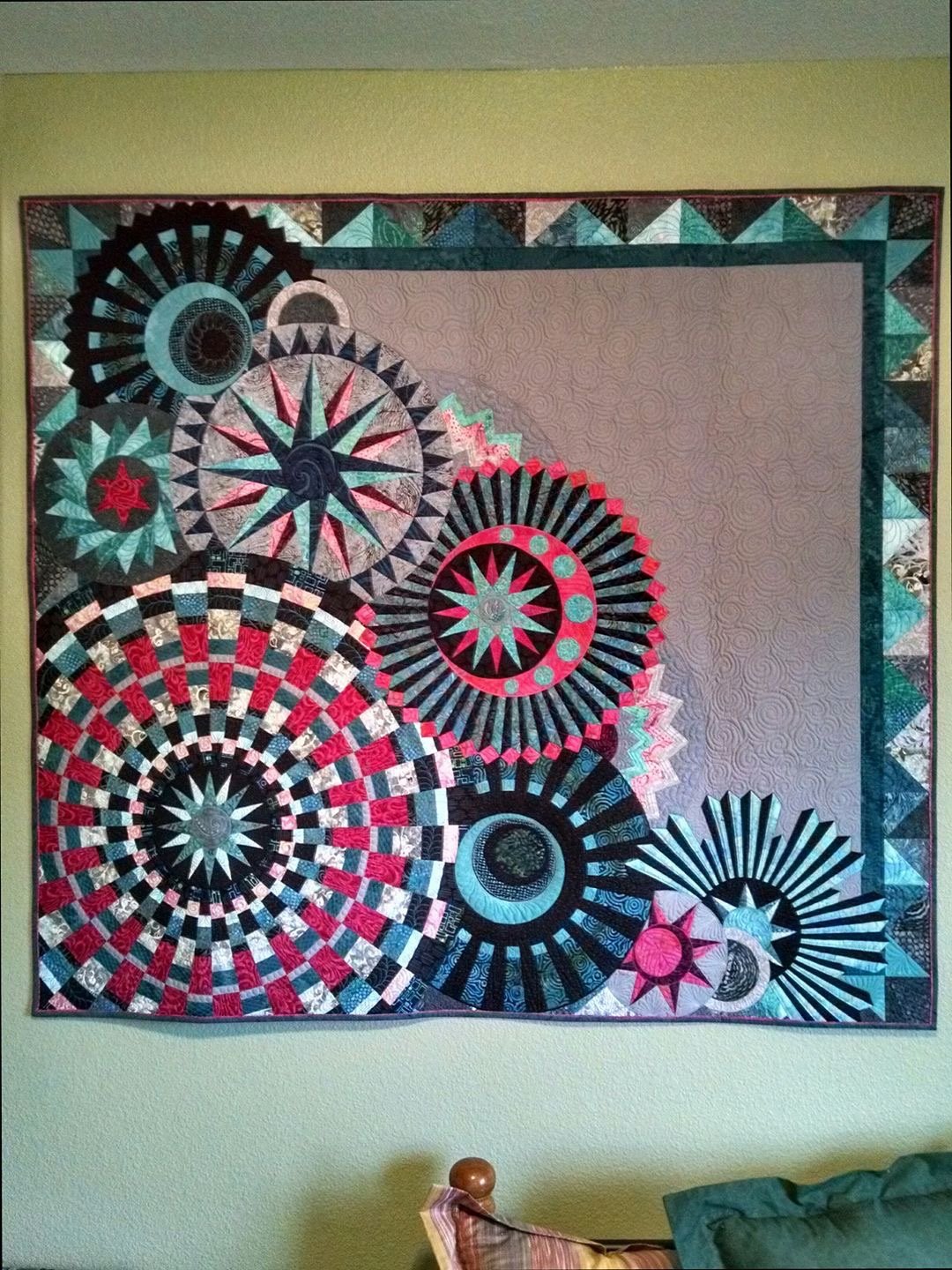 Original design using mariners compass paper piecing patterns and the Wedge ruler. Second quilt in a series of three.