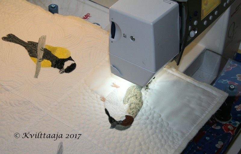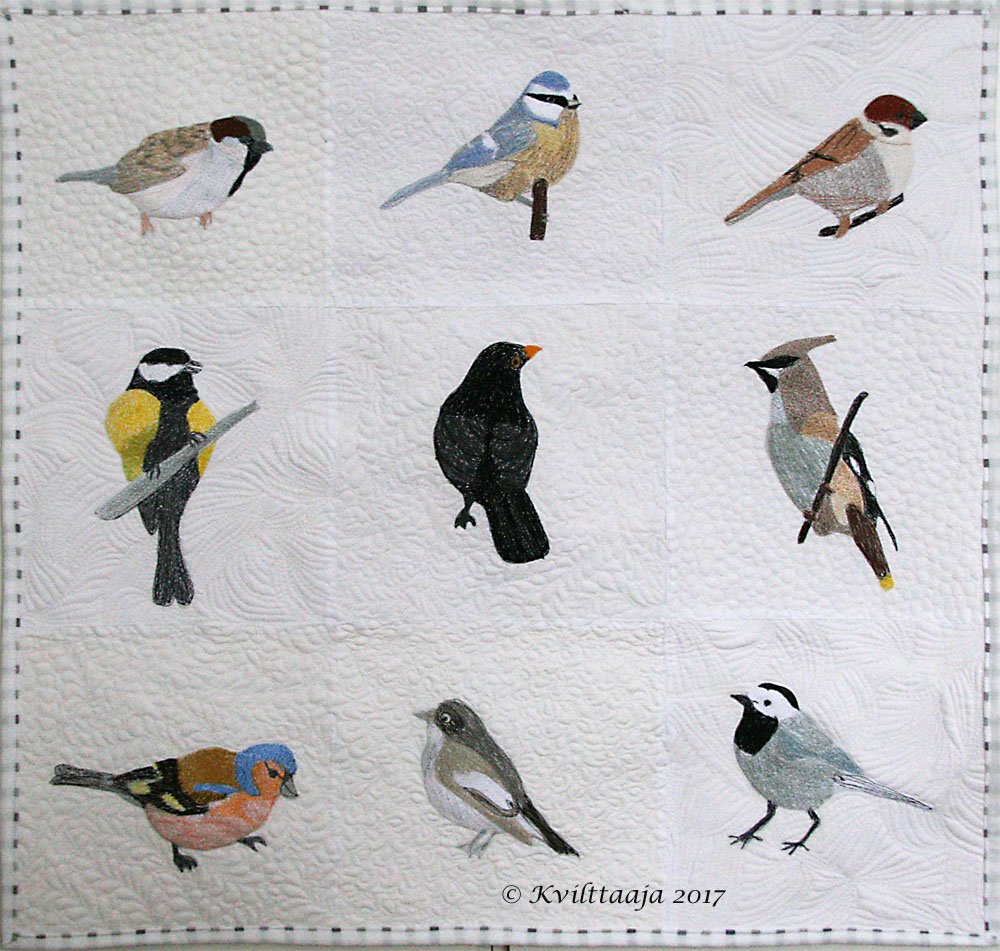 From my own photographs of birds living in my neighbourhood in Helsinki, Finland I free motion embroidered blocks on white cotton. Sewed them together and free motion quilted heavily around. Since there is no quilting on the birds they rise up brom the background. Cotton batting and backing. For this quilt I used nine of my embroidered bird.