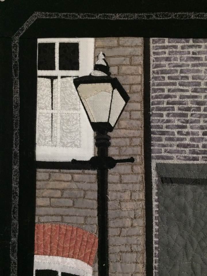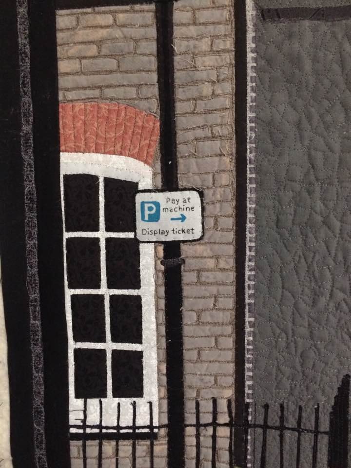Old cars and Old buildings are beautiful! This is an image taken from the streets of London. It is made entirely of fabric. I used raw edge applique to assemble it. The brick and mortar on the building is assembled using a solid fabric underlay and on top for the mortar I drew the lines of a brick pattern and cut out the openings for the brick. Total time from start to finish was 72 hours. The street sign is drawn with a fabric pen.