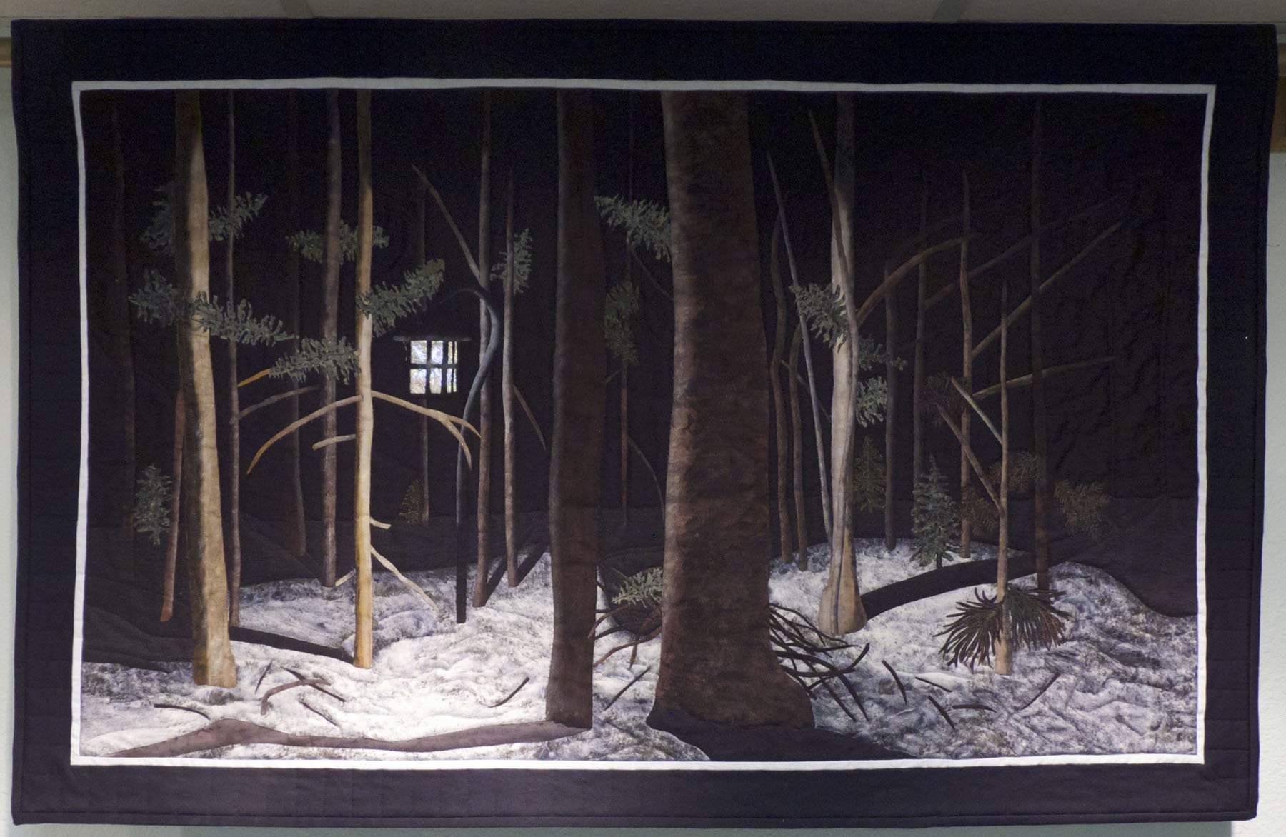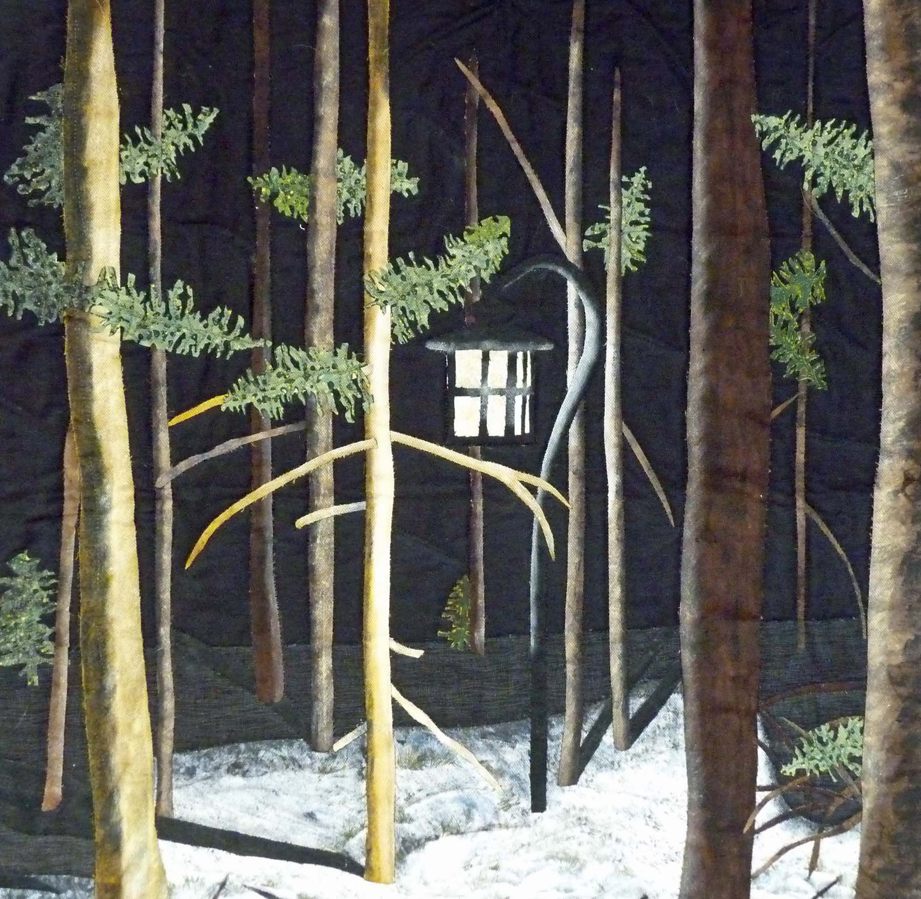 This landscape quilt (43 3/4" x 28") is based on a photograph by Mike Taylor, Photographer in Maine. This is a raw-edge applique landscape made with cotton fabrics including batiks. I painted the shadows with Shiva Artist's Painstiks. The lantern light is Angelina fibers and Textiva film. The batting is black Hobbs 80/20. Quilted on my Viking Sapphire 835. I enjoy making realistic art quilts, especially with lights and luminescence. This quilt has been sold.