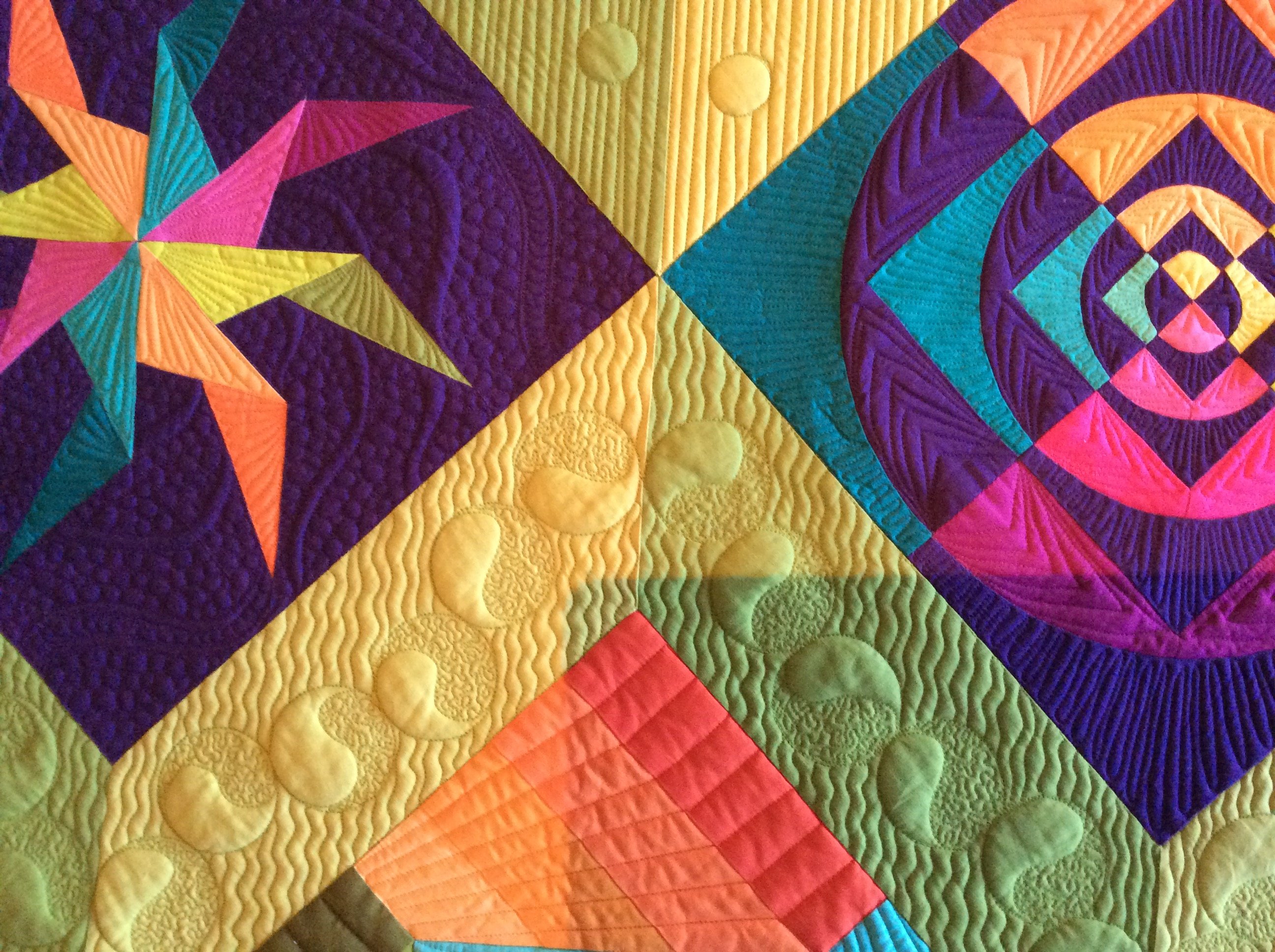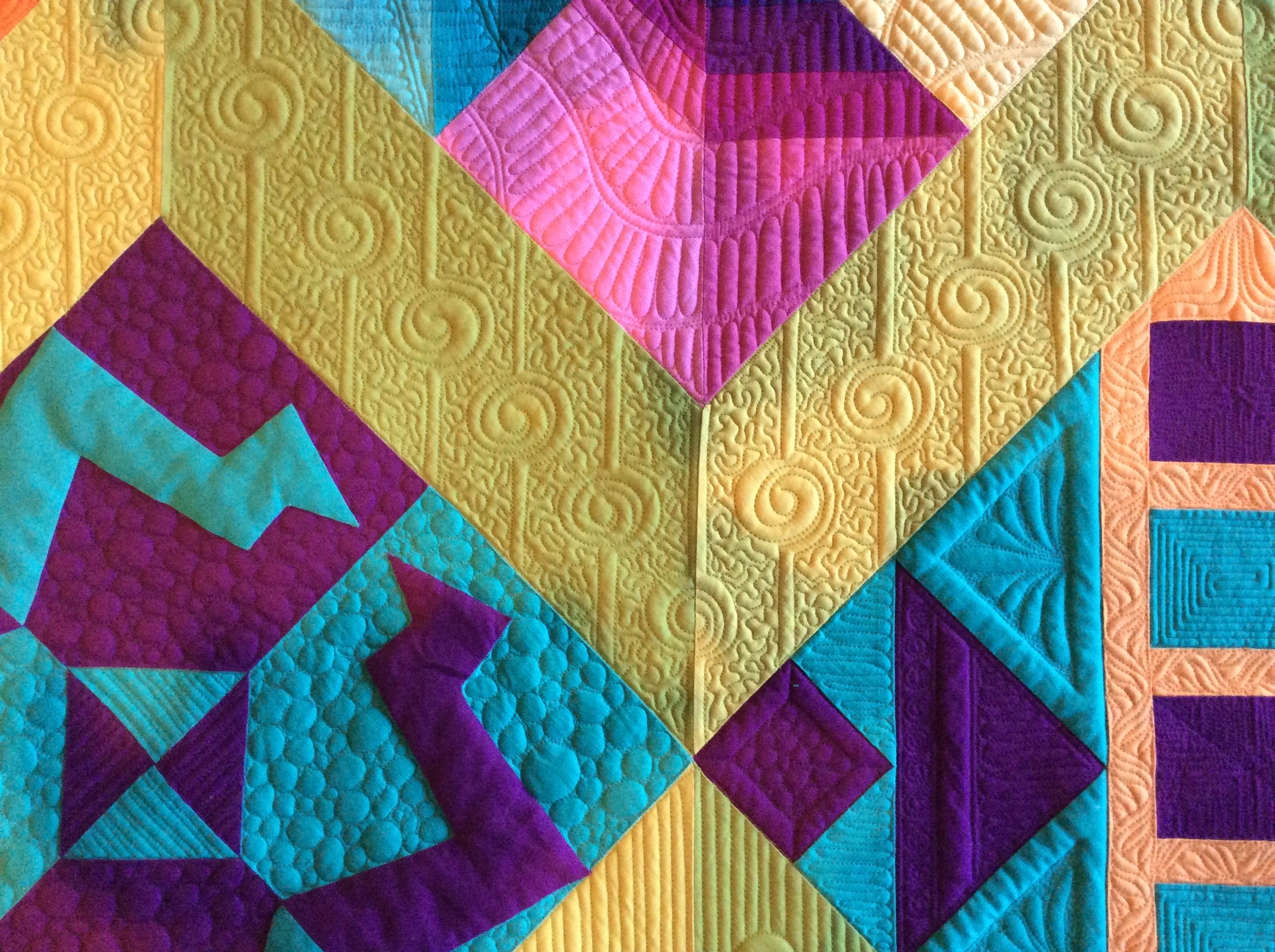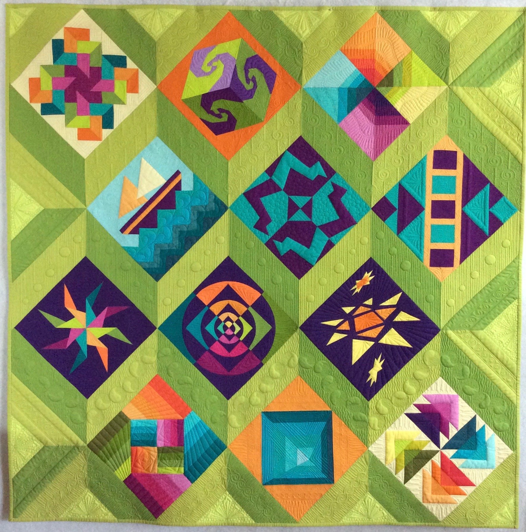 The Modern Quilts Unlimited magazine/Michael Miller fabrics "What's Old is New" block and quilt challenge was the inspiration. Each month we were challenged to take a specific traditional block and design an original, more modern 12” block. 11 of the 12 blocks were designed on EQ7 and all were foundation pieced. For the final challenge, we were to design a modern quilt in the size constraints of 60”x 60” or less, utilizing all 12 blocks. My goal was to apply some aspect of depth to the blocks and final layout using different shades of the base colors. There are 36 different Michael Miller Cotton Couture fabrics. Green acts as a neutral and, as in nature, goes with all colors. Despite the disparity of the block designs and the color variations, the layout and quilting unifies the blocks and they all work well together; thus, the name "Playing Well Together". This quilt was the Michael Miller Fabrics Choice Award winner. It also won First place in the Modern Category in the new exhibit “A Celebration of Color” that debuted at International Quilt Festival in Chicago April, 2017 and will be on tour for 2 years.