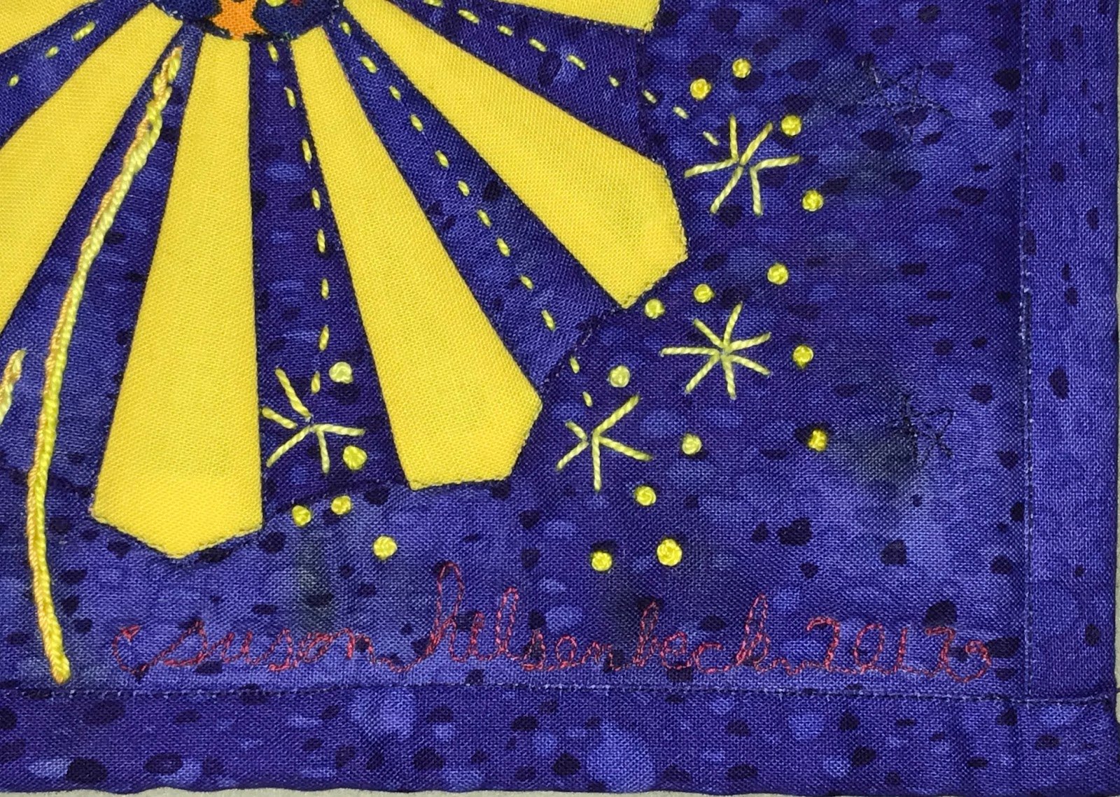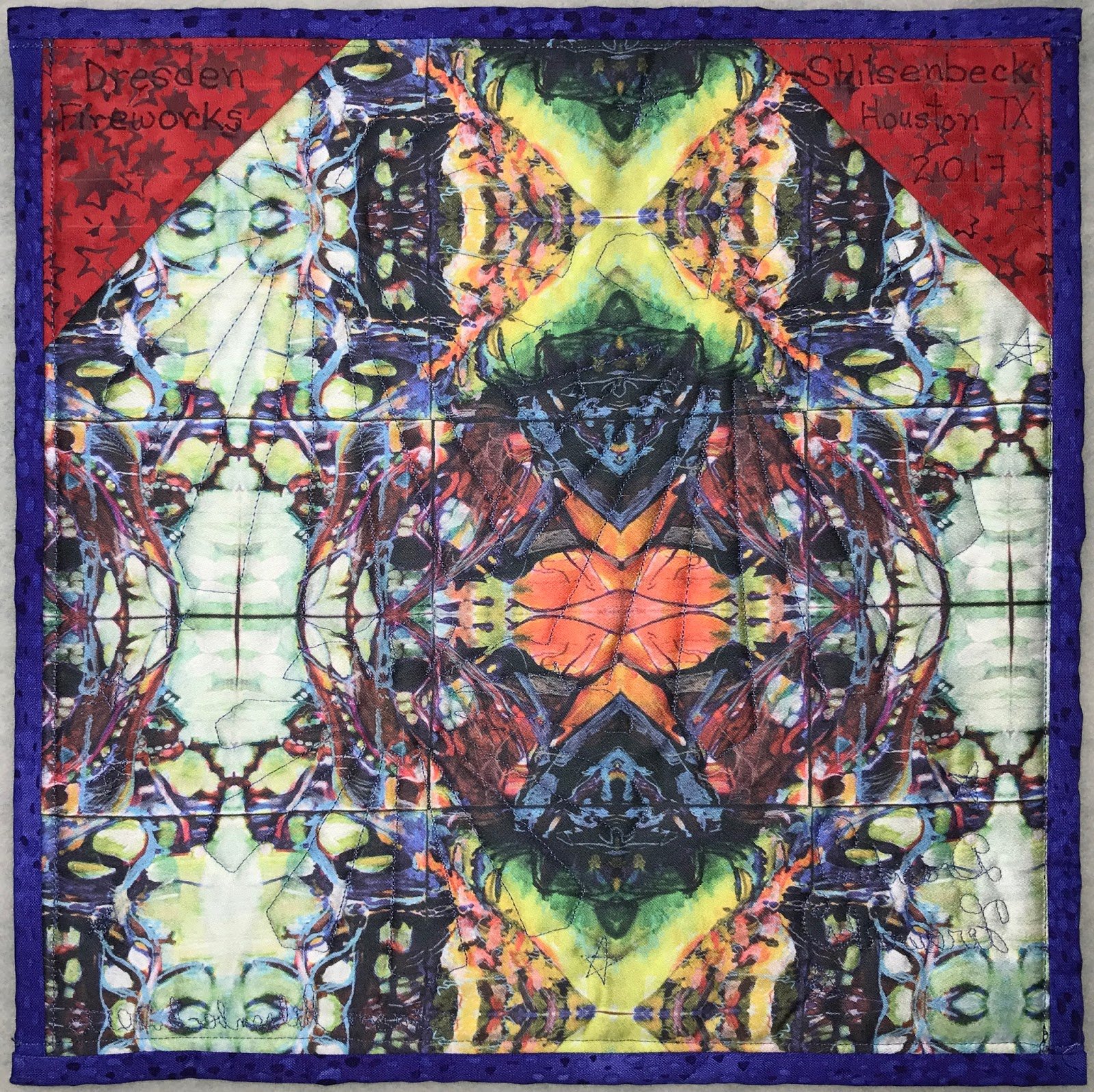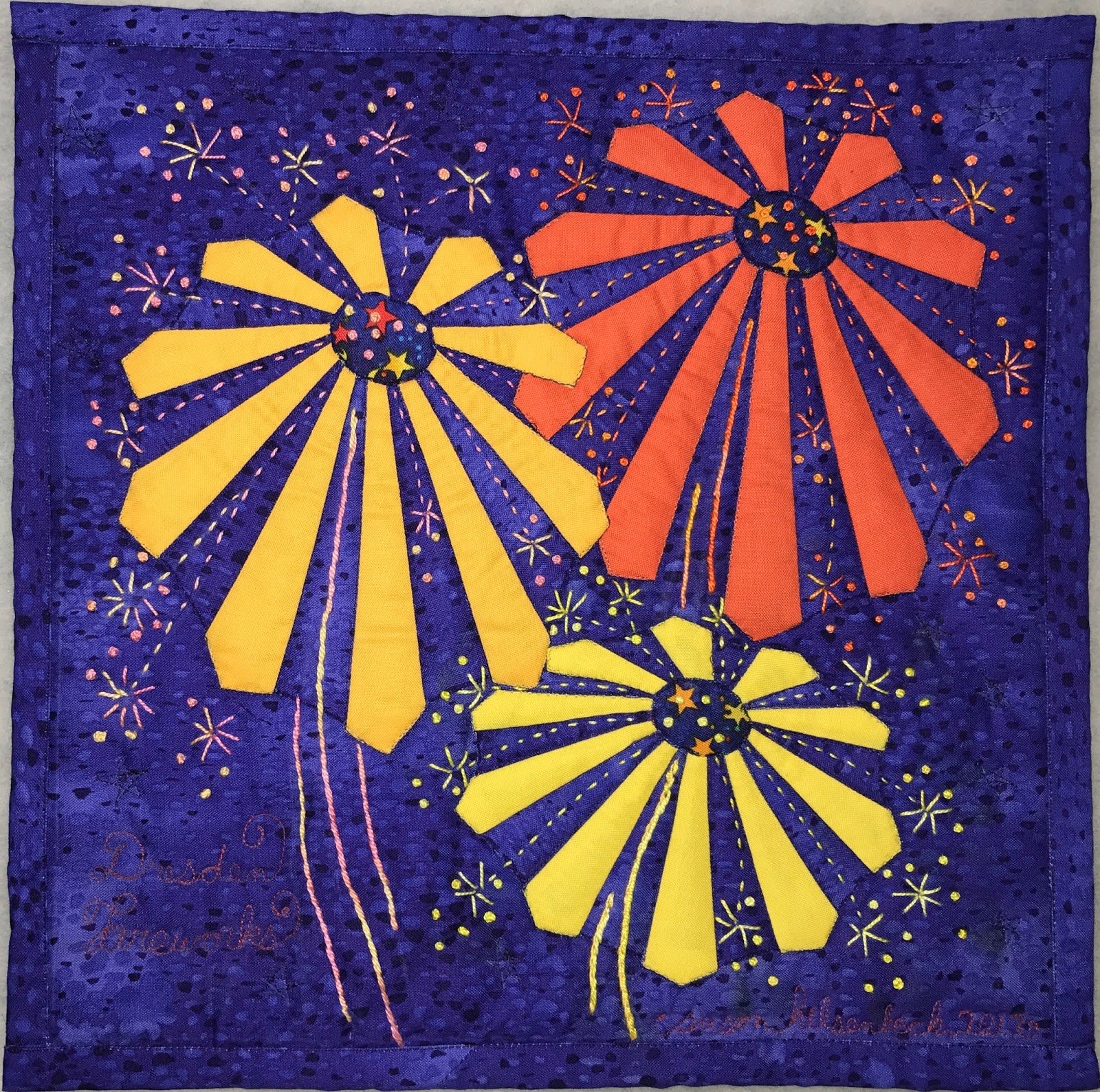Small art quilt featuring asymmetric paper-pieced Dresden plates as aerial fireworks. This is my 2017 donation to the SAQA benefit auction. It is a follow-up to last years Dresden Daisies. For more details see https://susieturn.blogspot.com/2017/04/dresden-fireworks.html