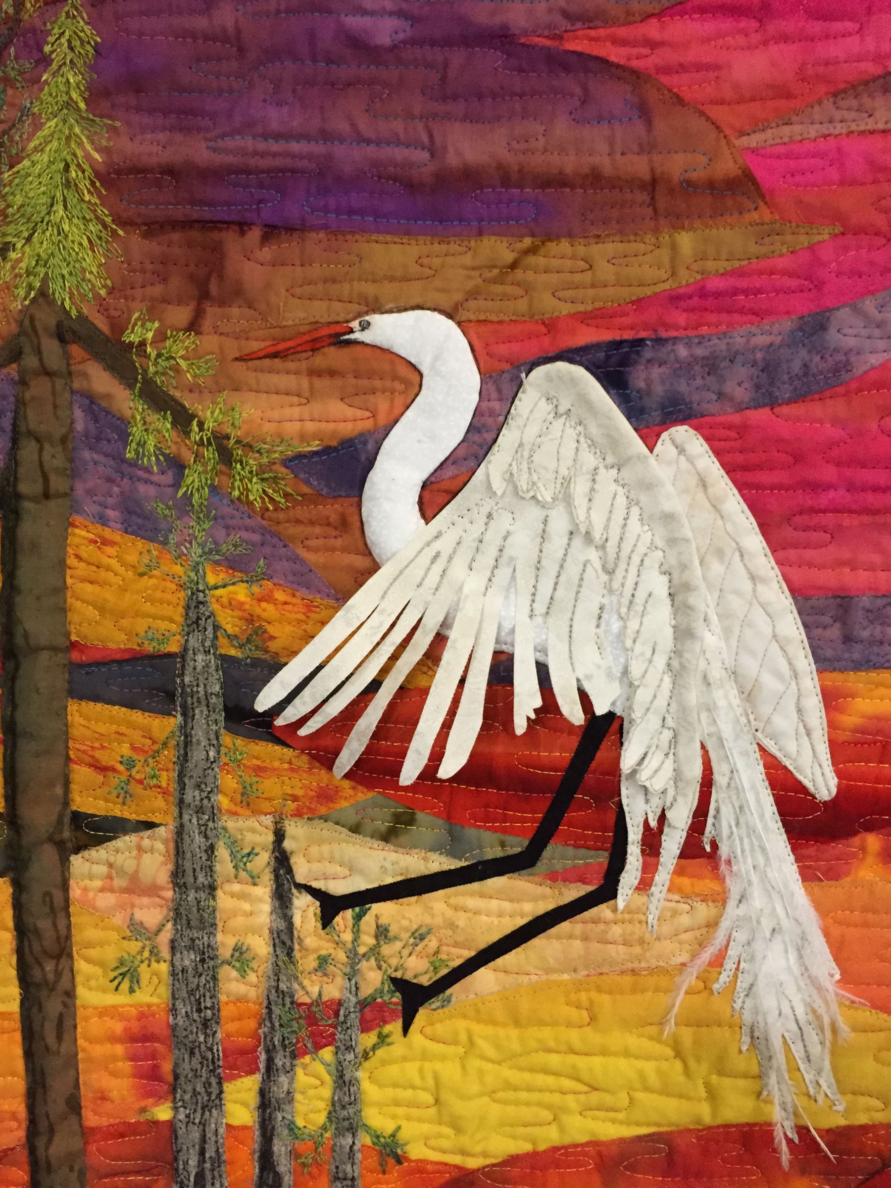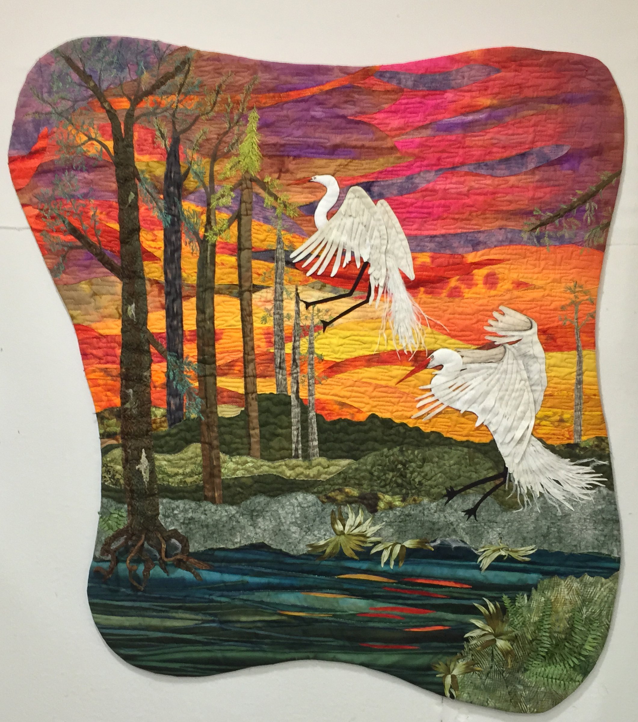 Inspired by a painting by Ted CoConis (with his permission), this wall hanging depicts the magnificent egrets that inhabit Florida wetlands.