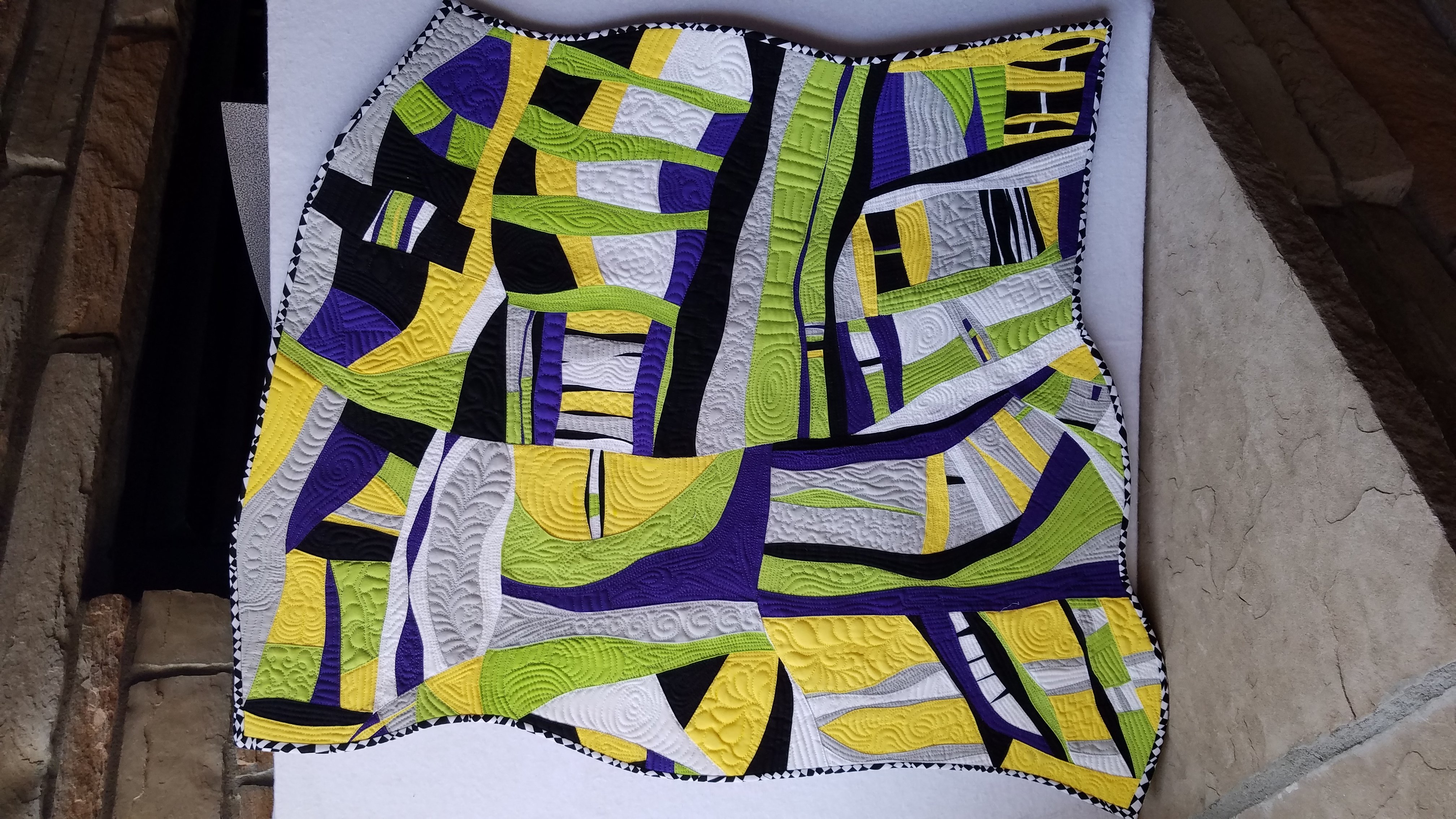 This quilt was pieced (no raw edges), cutting & sewing random shapes. I learned this technique from Sheila Frampton-Cooper and added my own spin to it. It was fun to free motion quilt different motifs in each shape. I used my Babylock Elisimo gold domestic sewing machine throughout the quilt. So much fun!
