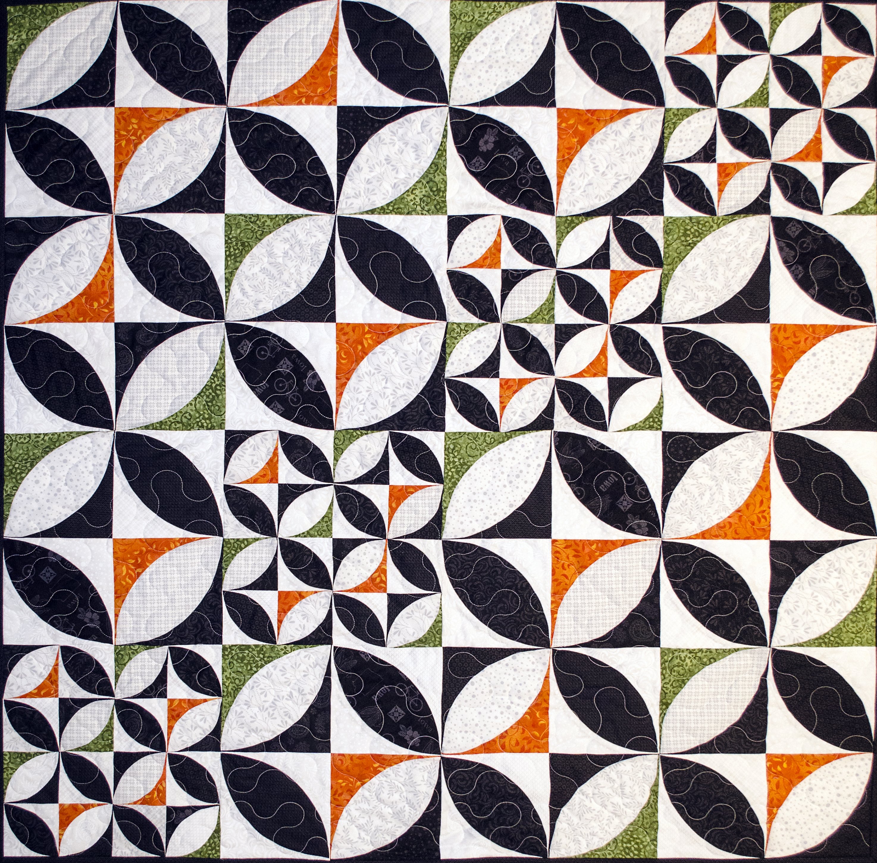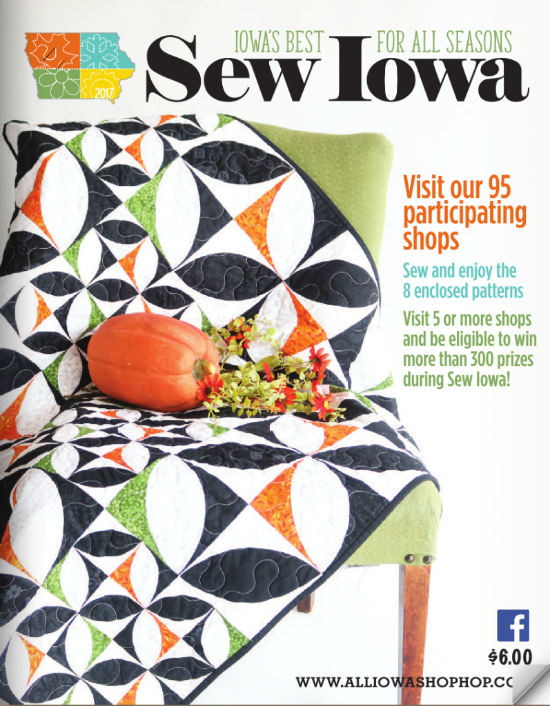 This was a quilt I made for the 2017 Iowa Shop Hop Challenge. Our region of Iowa was given the fall theme and a pre-selected set of specialty designed fabrics produced by Wilmington Fabrics to create a quilt to inspire the quilters throughout the state with projects. The challenge rules were to incorporate as many of the specialty fabrics and we could add any accent colors that gave the final project a fall look and feel. I choose the pumpkin seed or orange peel block and changed the scale of the blocks which ran diagonally across the middle. The quilt is a table topper and is simply quilted with a large meander. After watching the Mary Kerr show I thought it would be fun to share this quilt. It is modern but is based on a very old pumpkin seed block.