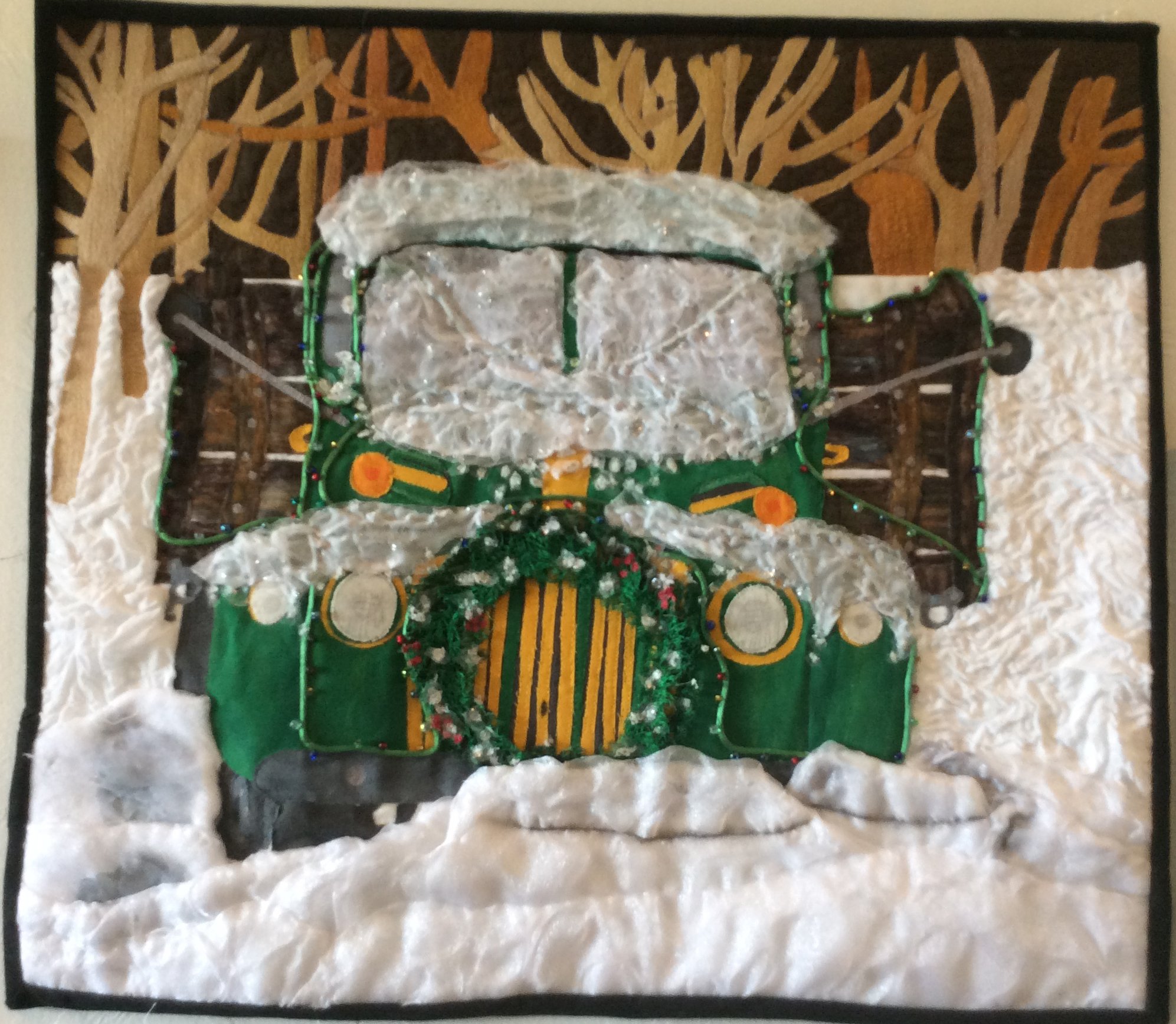 I used "prom dress fabric" and a heat gun to achieve the snow, along with some sparkly fabric to enhance. The light string is a cord with beads sewn onto it.