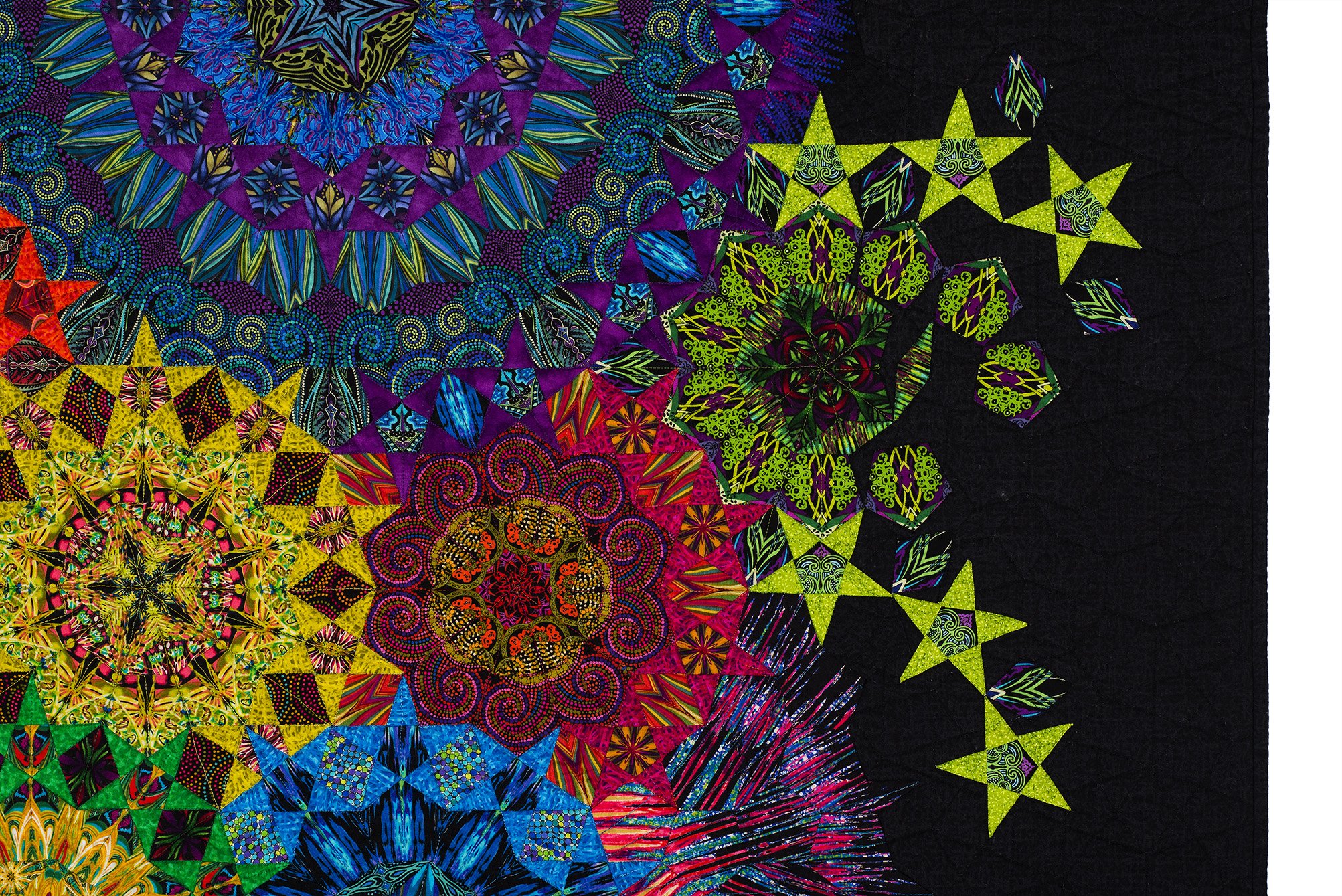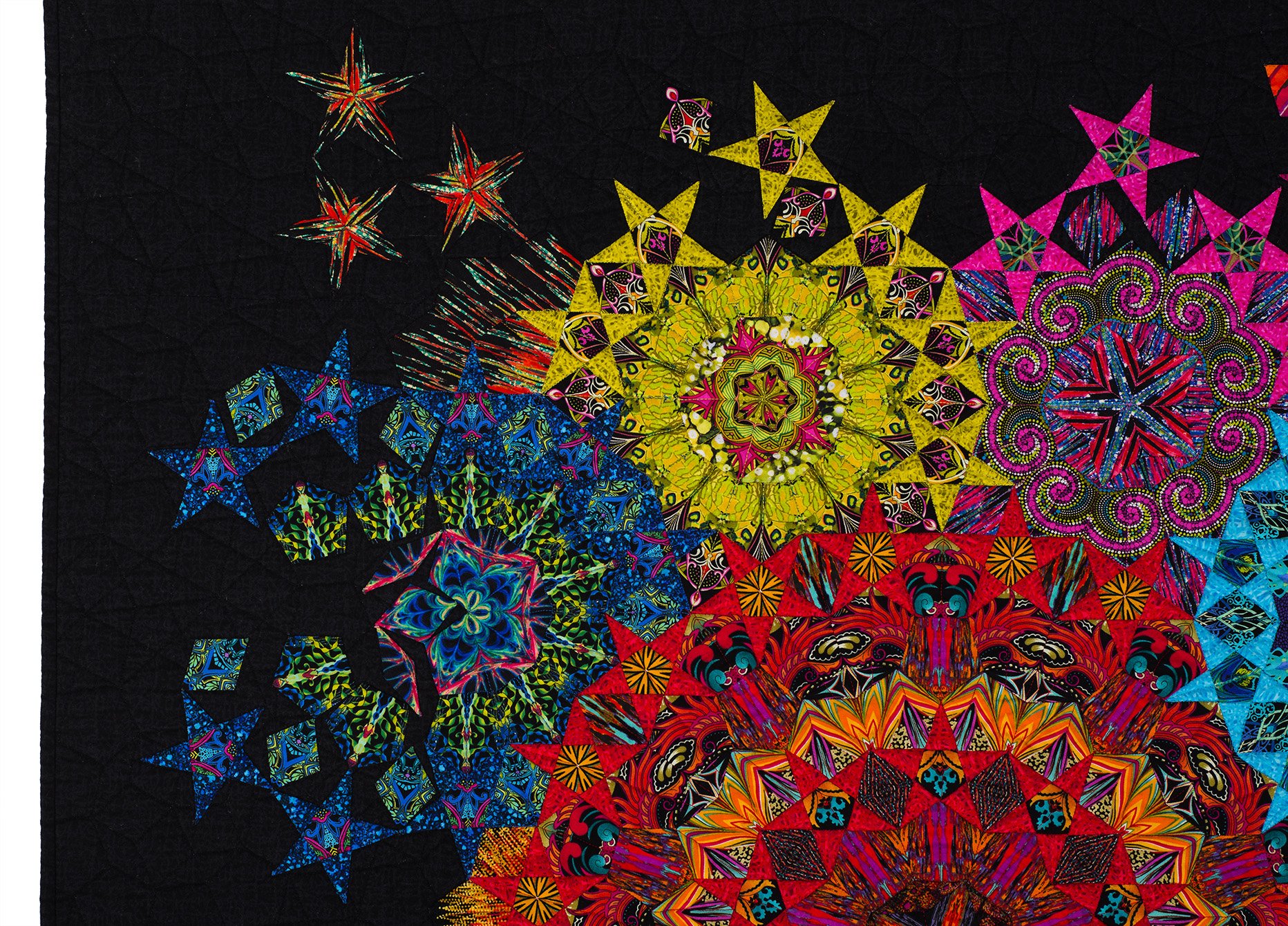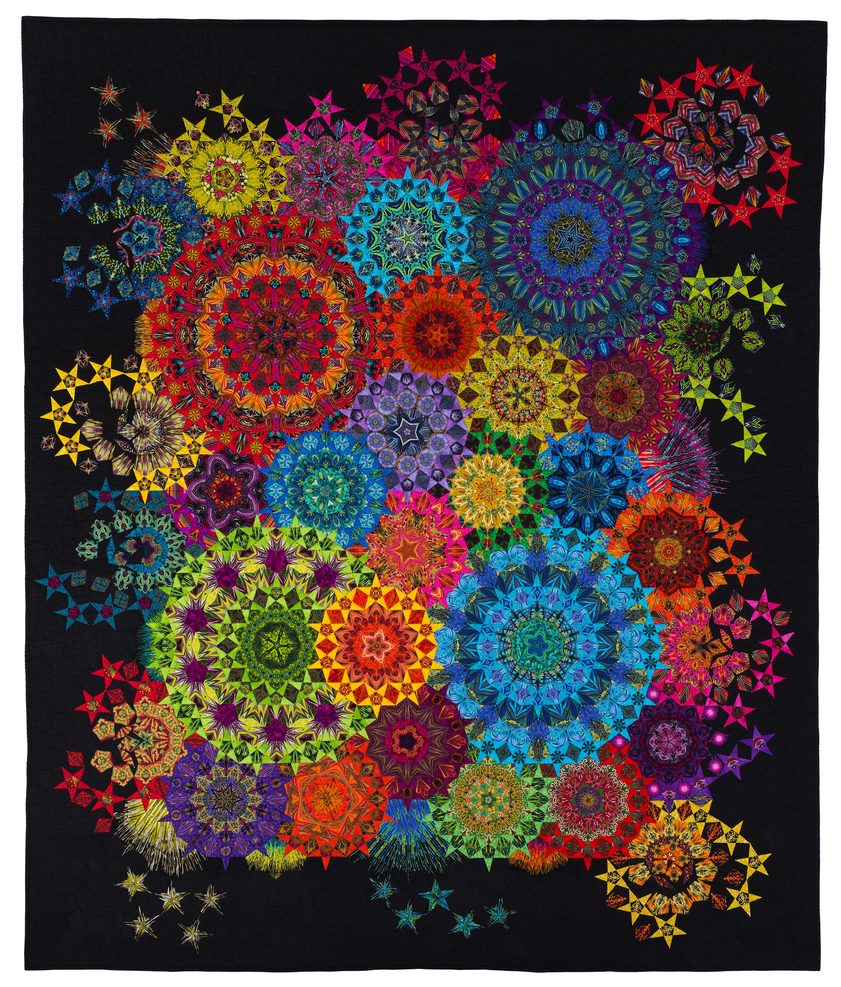 This quilt was displayed at the 2017 AQS Fall Paducah show and Road to California 2018. It won First Prize in the Traditional category of the “Celebration of Color” exhibition at the 2018 International Quilt Festivals in Chicago and was also on display at the Houston International Quilt Festival in November 2018. It is currently on display in a special exhibit of English paper-pieced quilts at the Rocky Mountain Quilt Museum in Golden, Colorado.