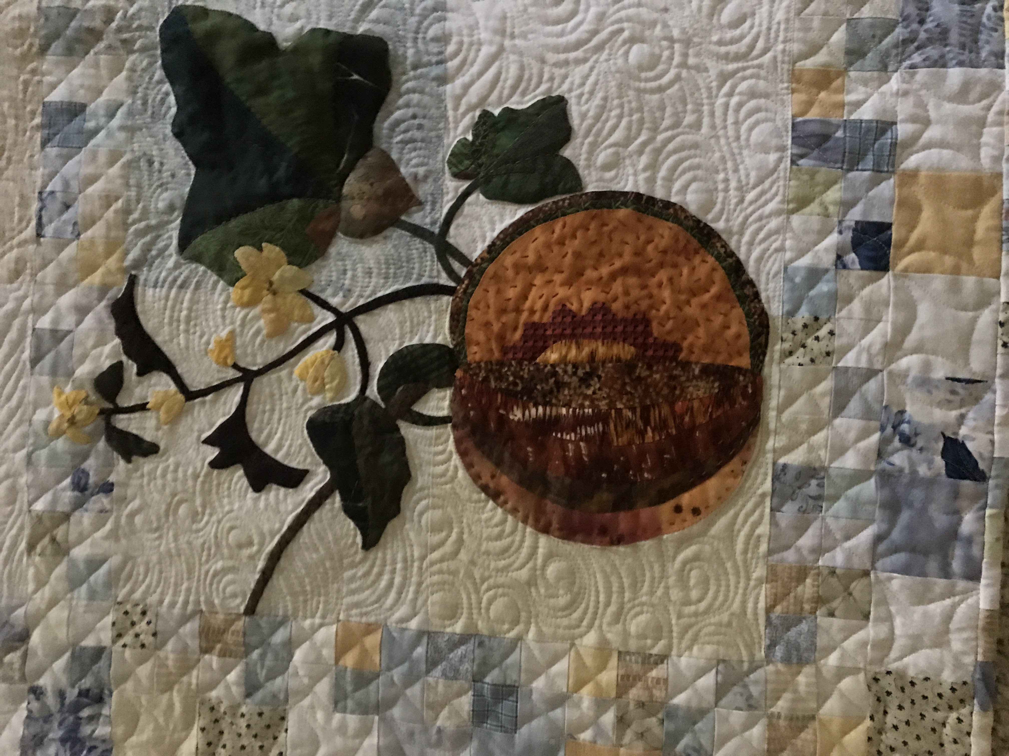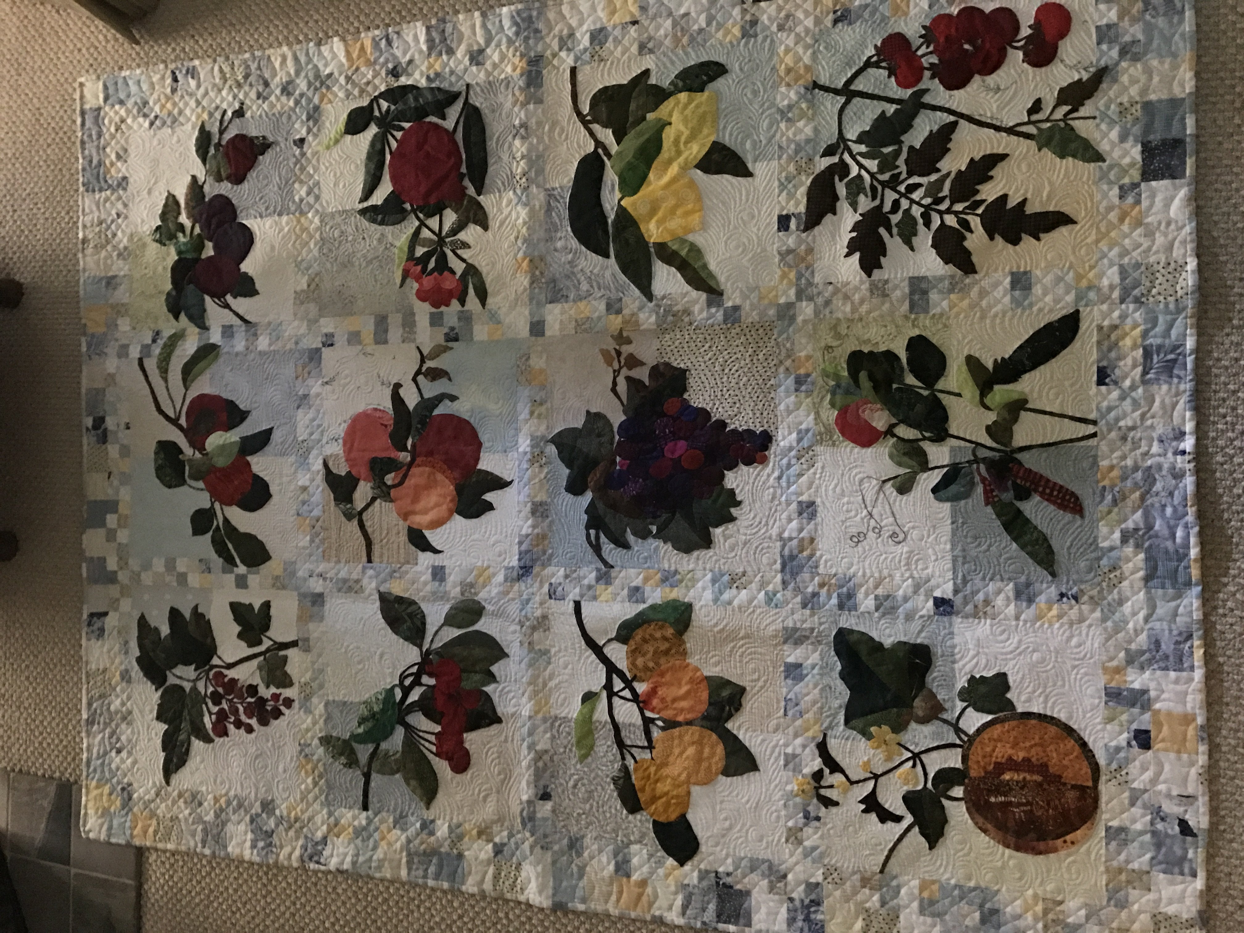 Hand appliqued fruits and veggies with machine pieced background and binding. Big stitch hand embroidery on applique done by Tracy.