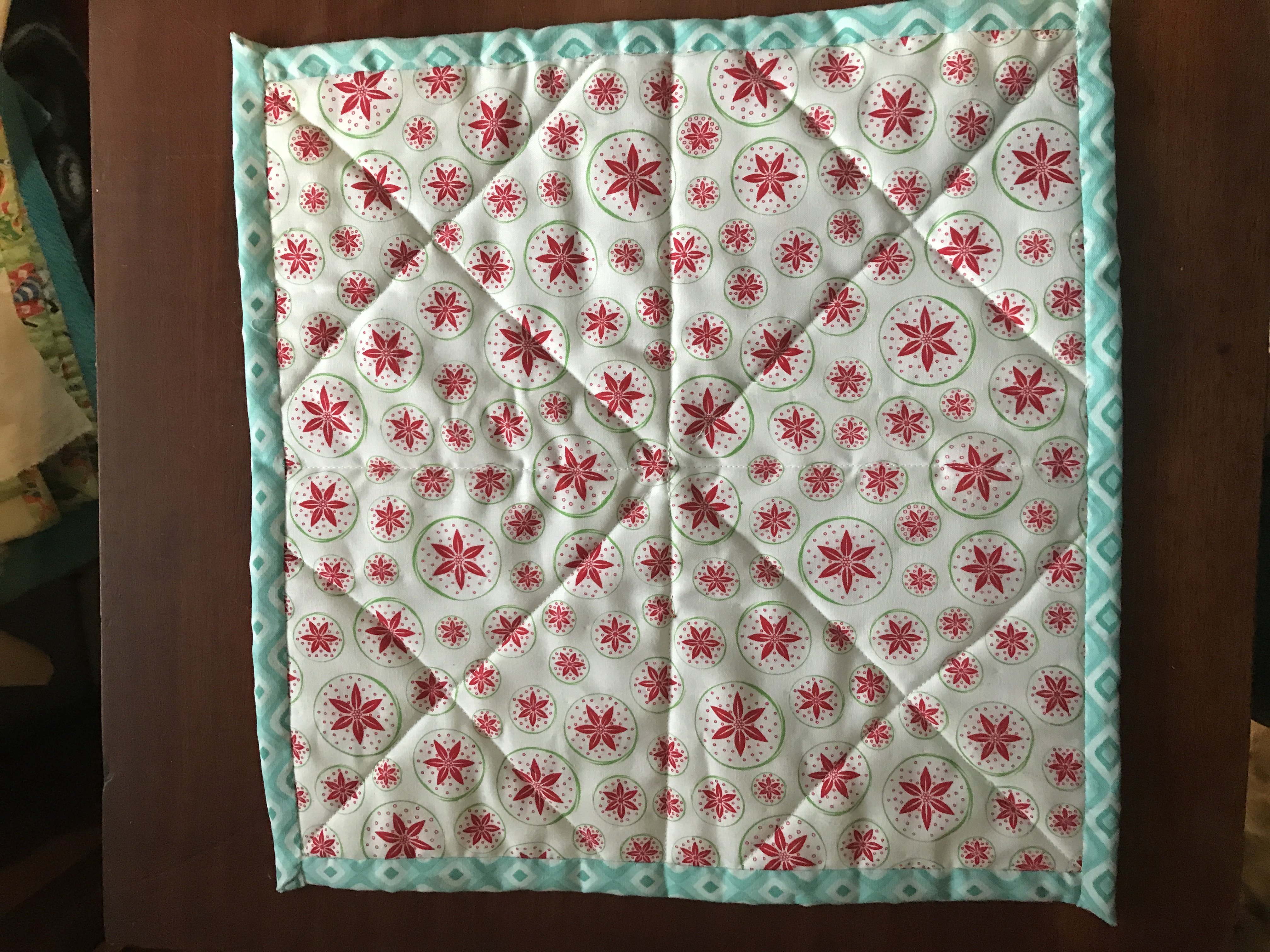 13 inch square finished Sept 4, 2017. Connecting Threads pattern and fabric. Batting pieced fleece.